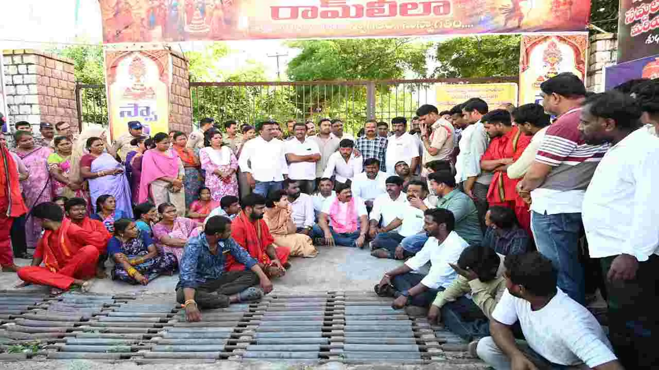 దసరా సందర్భంగా నగరంలోని రాంనగర్ మార్క్ఫెడ్ మైదానంలో రాంలీల వేడుకలను ఆ ప్రాంత మాజీ కార్పొరేటర్ బోనాల శ్రీకాంత్ ఆధ్వర్యంలో 15 ఏళ్లుగా నిర్వహిస్తూ వస్తున్నారు. మాజీ మంత్రి, కరీంనగర్ ఎమ్మెల్యే గంగుల కమలాకర్ ఈ కార్యక్రమానికి ప్రతియేటా అతిథిగా హాజరవుతూ వస్తున్నారు. ఈసారి రాంలీల కార్యక్రమం వివాదాస్పదంగా మారింది. గురువారం విజయదశమిరోజు ఈ వేడుక జరుగాల్సి ఉండగా మంగళవారం ఆ మైదానం గేట్లకు అధికారులు తాళం వేశారు. అధికారపార్టీకి చెందిన పెద్దలు ఈ కార్యక్రమం తామే నిర్వహిస్తామంటూ అధికారులపై ఒత్తిడి తెచ్చి మార్క్ఫెడ్ గ్రౌండ్కు తాళం వేయించారని బీఆర్ఎస్ నేతలు విమర్శిస్తున్నారు. గ్రౌండ్కు తాళం వేయడాన్ని నిరసిస్తూ బీఆర్ఎస్ నగరశాఖ అధ్యక్షుడు చల్ల హరిశంకర్ ఆధ్వర్యంలో మంగళవారం ధర్నా నిర్వహించారు.