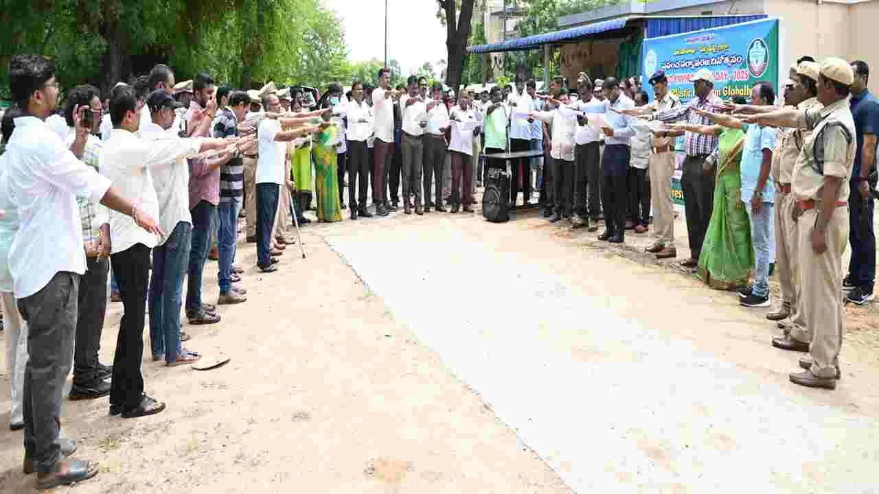 సమాజంలో ఆశిస్తున్న మార్పు మన నుంచే ప్రారంభం కావాలని, ప్లాస్టిక్ వాడకం తగ్గించాలని, చెత్తను సెగ్రిగేట్ చేయా లని కలెక్టర్ కోయ శ్రీహర్ష అన్నారు. గురువారం అటవీ శాఖ ఆధ్వర్యంలో ఏర్పాటు చేసిన ప్రపంచ పర్యావరణ దినోత్సవ కార్యక్రమంలో కలెక్టరేట్ ఆవ రణలో డీసీపీ కరుణాకర్, అదనపు కలెక్టర్ డి.వేణుతో కలిసి ఏక్ పెడ్ మాకే నామ్ కార్యక్రమంలో భాగంగా మొక్కలు నాటారు.
