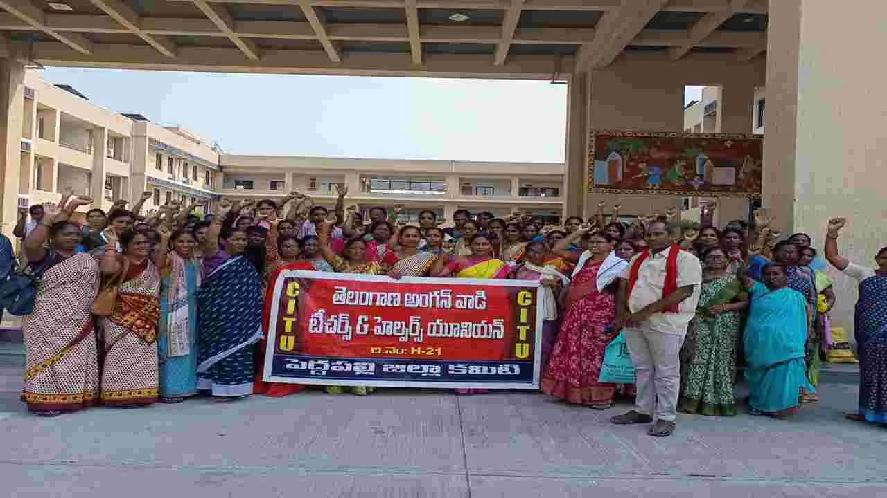 పెద్దపల్లి టౌన్, ఏప్రిల్ 24 (ఆంధ్రజ్యోతి): కర్నాటక రాష్ట్రంలో మాదిరిగా తెలంగాణలో అంగన్వాడీలకు మే నెలలో సెలవులు ప్రకటించాలని అంగ న్వాడీ టీచర్స్ అండ్ హెల్ఫర్స్ యూనియన్ (సిఐటియు) జిల్లా కమిటీ నాయకులు కోరారు. అంగన్వాడి కేంద్రాలకు వేసవికాలం సెలవులు ప్రక టించాలని కలెక్టరేట్ ఎదుట గురువారం ధర్నా నిర్వహించి వినతి పత్రం అందజేశారు. యూనియన్ జిల్లా ప్రధాన కార్యదర్శి జి.జ్యోతి మాట్లాడుతూ ఎండల తీవ్రత పెరుగుతున్న దృష్ట్యా కేంద్రాలకు పిల్లలను పంపడానికి తల్లులు ఆసక్తి చూపడం లేదని, దీనిని దృష్టిలో ఉంచుకుని సెలవులు ప్రకటించాలని డిమాండ్ చేశారు. సిఐటియు జిల్లా కార్యదర్శి ముత్యంరావు, శోభ, అంజనాదేవి, శ్యామల, రామలక్ష్మి, కృష్ణకుమారి, సుగుణ, మహేశ్వరి, సులోచన, వసంత, అంగన్వాడి టీచర్లు, ఆయాలు పాల్గొన్నారు.