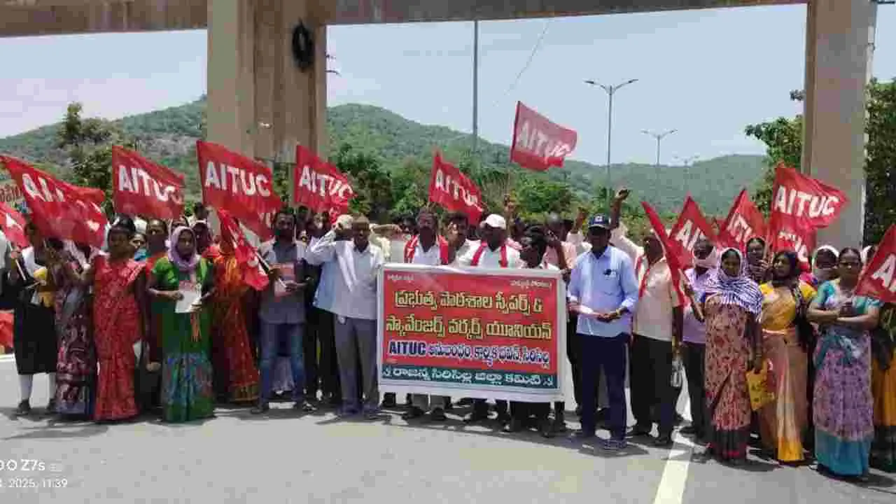 సిరిసిల్ల కలెక్టరేట్, జూన్ 4 (ఆంధ్రజ్యోతి) : ప్రభుత్వ పాఠశాలలలో పని చేస్తున్న స్వీపర్లు, స్కావెంజర్లకు గత ఏడు నెలలుగా వేతనాలు ఇవ్వడం లేద ని, కలెక్టర్ స్పందించి ఆ వేతనాలను చెల్లించాలని జిల్లా కన్వీనర్ లక్ష్మణ్ డిమాం డ్ చేశారు. సిరిసిల్ల జిల్లా కలెక్టరేట్ ఎదుట బుధవారం ఏఐటీయూసీ ప్రభుత్వ పాఠశాల స్వీపర్స్, స్కావెంజర్స్ వర్కర్స్ యూనియన్ జిల్లా కమిటీ ఆధ్వర్యంలో కార్మికులతో కలిసి నాయకులు ధర్నా చేశారు. ఈ సందర్భంగా లక్ష్మన్ మాట్లాడు తూ గత నాలుగుసార్లు వేతనాలు ఇవ్వాలంటూ జిల్లా కలెక్టరేట్ ఎదుట ధర్నాలు చేసినా ఎవరూ పట్టించుకోవడం లేదన్నారు. ఇప్పటికైనా కలెక్టర్ స్పందించి జిల్లాలోని ప్రభుత్వ పాఠశాలల్లో పనిచేస్తున్న స్వీపర్లు, స్కావెంజర్లకు రావా ల్సిన వేతనాలను ఇప్పించి ఆదుకోవాలని కలెక్టరేట్ ఏవోకు వినతిపత్రాన్ని అందిం చారు. ఈ కార్యక్రమంలో యూనియన్ నాయకులు వెంకటేష్, దేవయ్య, రాజు, మహేష్, పర్శరాములు, సాయికృష్ణ, రాజు, లత, లావణ్య, అనిత, లక్ష్మీ, రాధిక, జ్యోతి, శ్యామల, శోభ, పోచవ్వ, నర్సవ్వ, కవిత, మహేశ్వరీ, సునీత, స్వర్ణ, మల్లే శ్వరీ, రేణుక తదితరులు పాల్గొన్నారు.