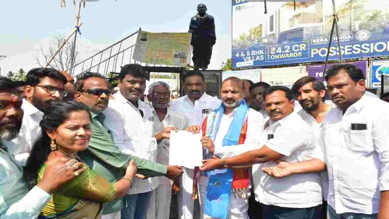 భగత్నగర్, మార్చి 16 (ఆంధ్రజ్యోతి): తెలుగుయూనివర్సిటీకి పొట్టి శ్రీరాములు పేరునే కొనసాగించాలని కోరుతూ కరీంనగర్ ఆర్య వైశ్యసంఘాల ఆధ్వర్యంలో కేంద్ర హోం శాఖ సహాయ మంత్రి బండిసంజయ్కుమార్కు ఆదివారం వినతి పత్రం అందించారు. పొట్టి శ్రీరాములు జయంతిని పురస్కరించుకుని నగరంలో కరీంనగర్ పట్టణ ఆర్యవైశ్య సంఘం అధ్యక్షుడు నగునూరి రాజేందర్ ఆధ్వర్యంలో నిర్వహించిన కార్యక్రమంలో బండి సంజయ్కుమార్ పాల్గొన్నారు. ఈ సందర్భంగా ఆయన మాట్లాడుతూ స్వాతంత్య్ర సమరయోధుడు పొట్టిశ్రీరాములు పేరును తెలుగుయూనివర్సిటీకి తొలగించడం సిగ్గుచేటన్నారు. తెలుగుయూనివర్సిటీకి ఆయన పేరును కొనసాగించాలని డిమాండ్ చేశారు. ఈ సందర్భంగా కరీంనగర్పట్టణ ఆర్యవైశ్యసంఘం అద్యక్షుడు నగునూరి రాజేందర్ మాట్లాడుతూ ప్రభుత్వం వెంటనే స్పందించి నిర్ణయాన్ని వెనక్కి తీసుకోవానలి లేకపోతే రాష్ట్రవ్యాప్తంగా నిరసన కార్యక్రమాలు నిర్వహిస్తామన్నారు. జిల్లా ఆర్యవైశ్యసంఘం అధ్యక్షుడు కన్న క్రిష్ణ మాట్లాడుతూ గాంధేయవాది అయిన పొట్టి శ్రీరాములు పేరును తెలుగు యూనివర్సిటీకి తొలగించడం సబబు కాదన్నారు. కార్యక్రమంలో మాజీ మేయర్ సునీల్రావు, బుస్స శ్రీనివాస్, మల్లికార్జున్, పొట్టి శ్రీరాములు ఫౌండేషన్ అధ్యక్షుడు ఉప్పల రామేశం, పట్టణ ప్రధాన కార్యదర్శి పెద్ది వేణు, సుద్దాల వెంకటేశ్, కొంజర్ల శ్రీకాంత్, కొమురవెళ్లి వెంకటేశం, జిడిగె సాయికృష్ణ, జిల్లా మహిళా అధ్యక్షురాలు చకిలం స్వప్న, రావికంటి భాగ్యలక్ష్మి పాల్గొన్నారు.