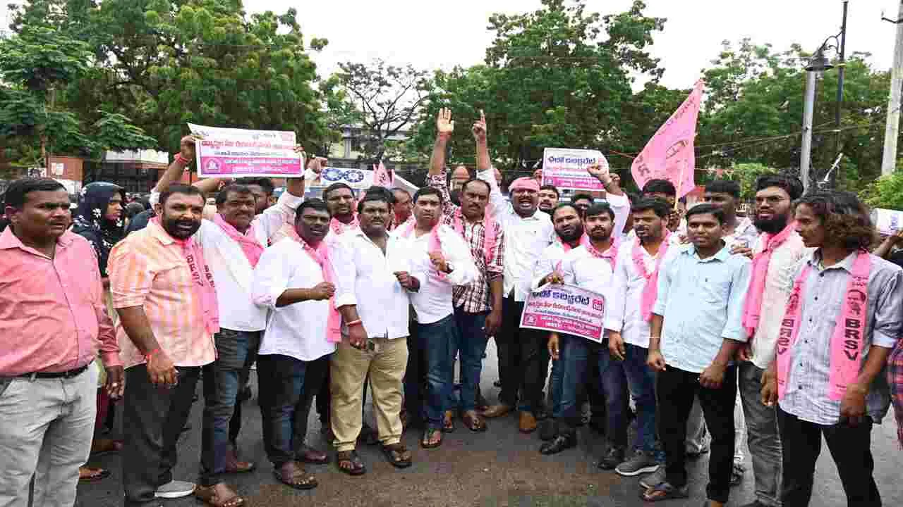 సుభాష్నగర్, అక్టోబరు 29 (ఆంధ్రజ్యోతి): ఫీజు రీయింబర్స్మెంట్, స్కాలర్షిప్ బకాయిలు వెంటనే విడుదల చేయకపోతే రాష్ట్రాన్ని రణరంగంగా మారుస్తామని గ్రంథాలయ సంస్థ మాజీ చైర్మెన్ పొన్నం అనిల్కుమార్ హెచ్చరించారు. ఫీజు రీయింబర్స్మెంట్, స్కాలర్షిప్ బకాయిలను వెంటనే చెల్లించాలని డిమాండ్ చేస్తూ బీఆర్ఎస్వీ ఆధ్వర్యంలో కలెక్టరేట్ ఎదుట బుధవారం ధర్నా నిర్వహించారు. ఈ సందర్భంగా ఆయన మాట్లాడుతూ రాష్ట్రంలో తుగ్లక్ పాలన నడుస్తుందన్నారు. ముఖ్యమంత్రి విద్యాశాఖను తనవద్దే పెట్టుకొని ఎలాంటి సమీక్షలు నిర్వహించకుండా నియంత పాలన కొనసాగిస్తున్నాడని విమర్శించారు. ముఖ్యమంత్రి ఇప్పటికైనా స్పందించి బకాయిలను వెంటనే విడుదల చేయాలని డిమాండ్ చేశారు. అనంతరం జిల్లా కో ఆర్డినేటర్ ద్యావ మధుసూదన్రెడ్డి మాట్లాడుతూ విద్యార్థులతో పెట్టుకున్న ఏ ప్రభుత్వం బాగుపడలేదన్నారు. కార్యక్రమంలో మార్కెట్ కమిటీ చైర్మెన్ రెడ్డవేణి మధు, బండారపు అజయ్కుమార్, చుక్కా శ్రీనివాస్, బొంకూరి మోహన్, ఆరె రవి, గంగాధర చందు, నారదాసు వసంత్, వడ్లకొండ పరుశురామ్, రవితేజ, మున్నా, బండ వేణు, ధీరజ్, పబ్బతి శ్రీనివాస్రెడ్డి, ఆవుల తిరుపతి, ఒడ్నాల రాజు పాల్గొన్నారు.
