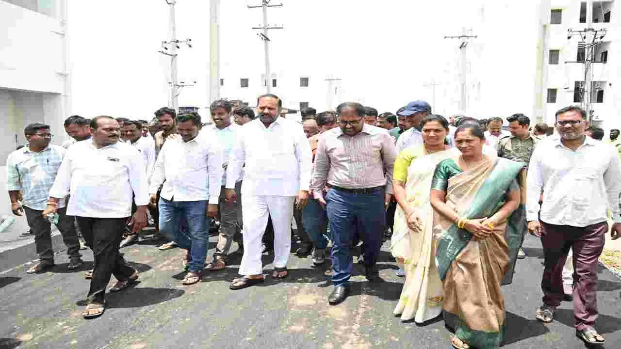 పెండింగ్లో ఉన్న చిన్న చిన్న పనులను పూర్తి చేసి ఎంపికైన లబ్ధిదారులకు రాష్ట్ర అవతరణ దినోత్సవం జూన్ 2 నాడు అప్పగిస్తామని పూర్తిస్థాయిలో 10న అందజేయనున్నట్లు తెలిపారు. డబుల్ బెడ్రూమ్ ఇండ్లకు ఎంపిక చేసిన లబ్ధిదారులకు ఇంటి తాళాలు అప్పగించి శుభ్రం చేయించాలని, ఓనర్ పేరు మీద విద్యుత్ మీటర్ మంజూరు చేయాలని ఎమ్మెల్యే సూచించారు. జూన్ 10వ తేదీలోపు మంత్రి చేతులమీ దుగా లబ్ధిదారుల గృహ ప్రవేశం చేయించేందుకు అవ సరమైన ఏర్పాట్లు పూర్తి చేయాలని అధికారులకు ఎమ్మెల్యే ఆదేశించారు. మున్సిపల్ కమిషనర్ వెంక టేష్, మార్కెట్ చైర్పర్సన్ ఈర్ల స్వరూప, అధికారులు, మాజీ కౌన్సిలర్లు, నాయకులు, కార్యకర్తలు, కాంట్రా క్టర్లు, లబ్ధిదారులు పాల్గొన్నారు.
