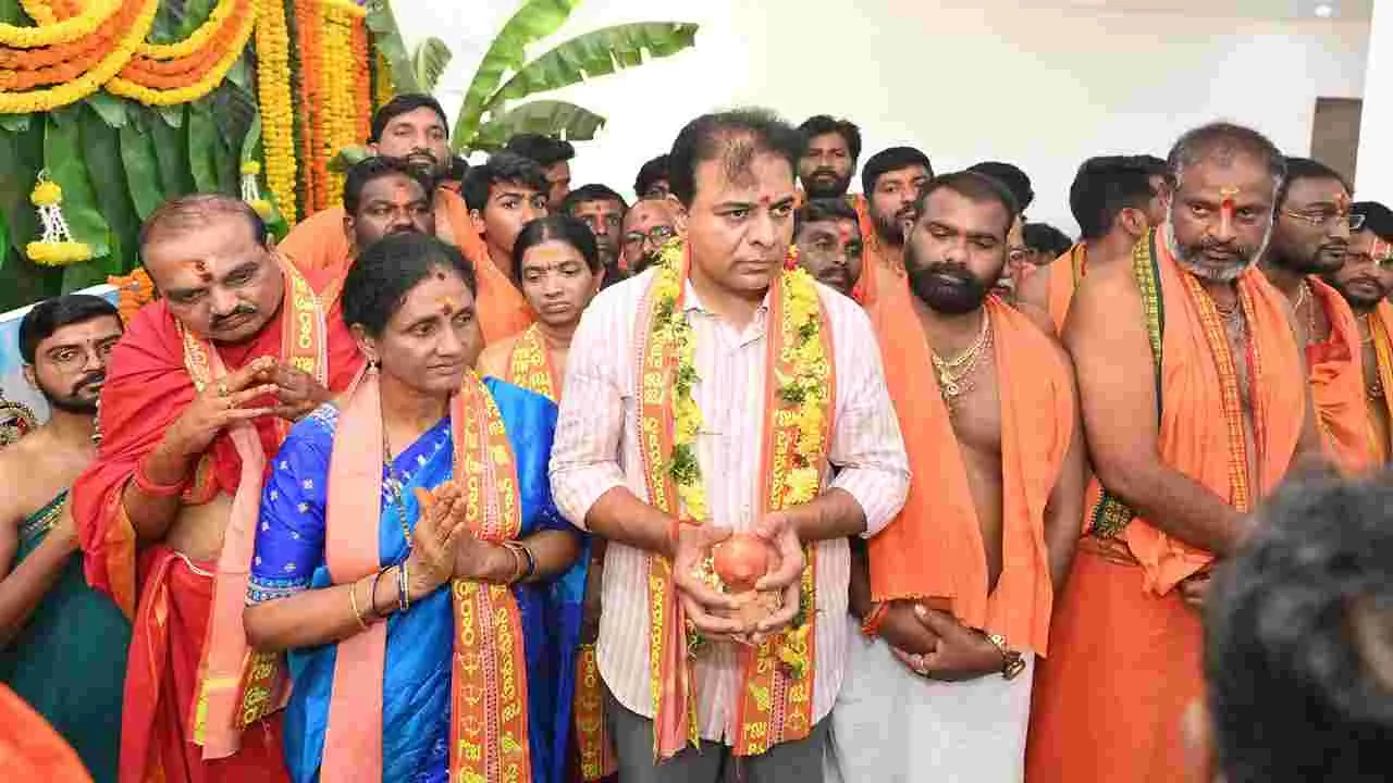 సిరిసిల్ల, ఏప్రిల్ 9 (ఆంధ్రజ్యోతి) : హనుమాన్ దీక్షాపరుల భజన లతో హనుమంతు వైభవ పూజ కన్నుల పండువగా జరిగింది. ముఖ్య అతిథిగా బీఆర్ఎస్ రాష్ట్ర వర్కింగ్ ప్రెసిడెంట్ కే తారకరామారావు పాల్గొన్నారు. బుధవారం సిరిసిల్లలోని బీఆర్ఎస్ జిల్లా కార్యాలయం తెలంగాణ భవన్లో హనుమాన్ దీక్షాదారులతో హనుమంతు వైభవ పూజ నిర్వహించారు. చక్రవర్తి సంకీర్తనచార్యుల ఆధ్వర్యంలో భక్తి శ్రద్ధలతో వైభవ పూజ ఘనంగా నిర్వహించారు. మాజీ మంత్రి కేటీఆర్ స్వయంగా పూజలో పాల్గొనడంతో పాటు దీక్షాదారులతో కలిసి అన్నప్రసాదం కార్యక్రమంలో పాల్గొన్నారు. వెంట బీఆర్ఎస్ జిల్లా అధ్యక్షుడు తోట అగయ్య, పట్టణ అధ్యక్షుడు జిందం చక్రపాణి, జడ్పీ మాజీ చైర్పర్సన్ న్యాలకొండ అరుణ, మాజీ వైస్చైర్మన్ సిద్ధం వేణు, బీఆర్ఎస్ వేములవాడ ఇన్చార్జి చల్మెడ లక్ష్మీనర్సింహారావు, మున్సిపల్ మాజీ చైర్పర్సన్ జిందం కళచక్రపాణి, మాజీ వైస్చైర్మన్ మంచె శ్రీనివాస్, బీఆర్ఎస్ నాయకులు బొల్లి రామ్మోహన్, చేపూరి నాగరాజు, అక్కరాజు శ్రీనివాస్, అగ్గిరాములు, ఎనుగు మనోహర్రెడ్డి, శరత్రావు, రాఘవరెడ్డి, మల్లారెడ్డి తదితరులు పాల్గొన్నారు.