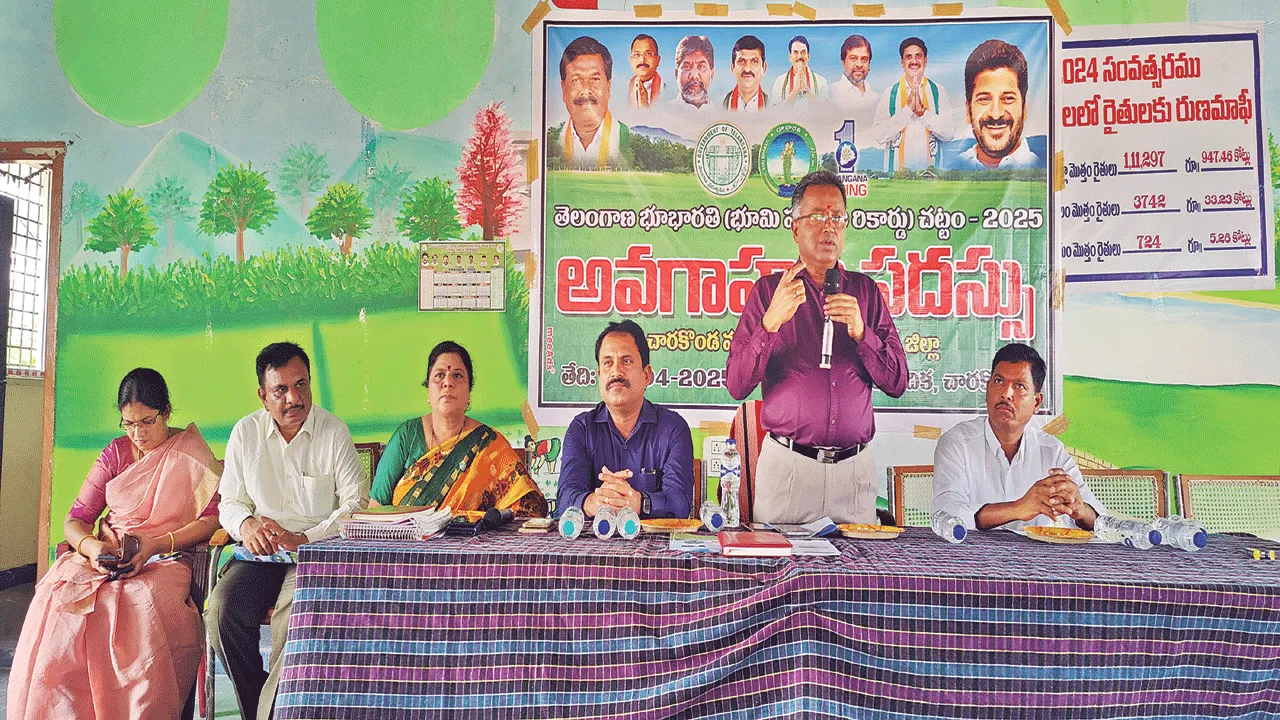 చారకొండ, ఏప్రిల్ 24 (ఆంధ్రజ్యోతి) : రాష్ట్ర ప్రభుత్వం ప్రతిష్టాత్మకంగా చేపట్టిన భూభారతి చట్టం-2025 ద్వారా భూ సంబంధ సమస్యలకు పరిష్కారం లభిస్తుందని అదనపు కలెక్టర్ అమ రేందర్ అన్నారు. గురువారం మండల కేంద్రం లోని రైతు వేదికలో తహసీల్దార్ అద్దంకి సునీత అధ్యక్షతన భూ భారతి 2025 చట్టంపై అవగా హన సదస్సు నిర్వహించారు. ఈ అవగాహన స దస్సుకు అదనపు కలెక్టర్ అమరేందర్, కల్వకుర్తి ఆర్డీవో శ్రీను ముఖ్య అతిథులుగా హాజరయ్యారు. ఈ సందర్భంగా అదనపు కలెక్టర్ మాట్లాడుతూ రైతుల దీర్ఘకాల సమస్యలు తీర్చడానికి రాష్ట్ర ప్ర భుత్వం భూ భారతి చట్టాన్ని తీసుకువచ్చిందని అన్నారు. గత ధరణి పోర్టల్ ద్వారా అధికారు లకు అధికారం లేకుండా ఉండేదని అన్నారు. నూతన భూ భారతి చట్టంలో రైతులకు అనేక సౌకర్యాలు కల్పించిందని పేర్కొన్నారు. అన్నా రు. భూ భారతి అవగా హన సదస్సుకు వచ్చిన వారికి మండల వైద్యాధి కారి డాక్టర్ మంజుభార్గ వి ఆధ్వర్యంలో వైద్యశి బిరం ఏర్పాటు చేశారు.