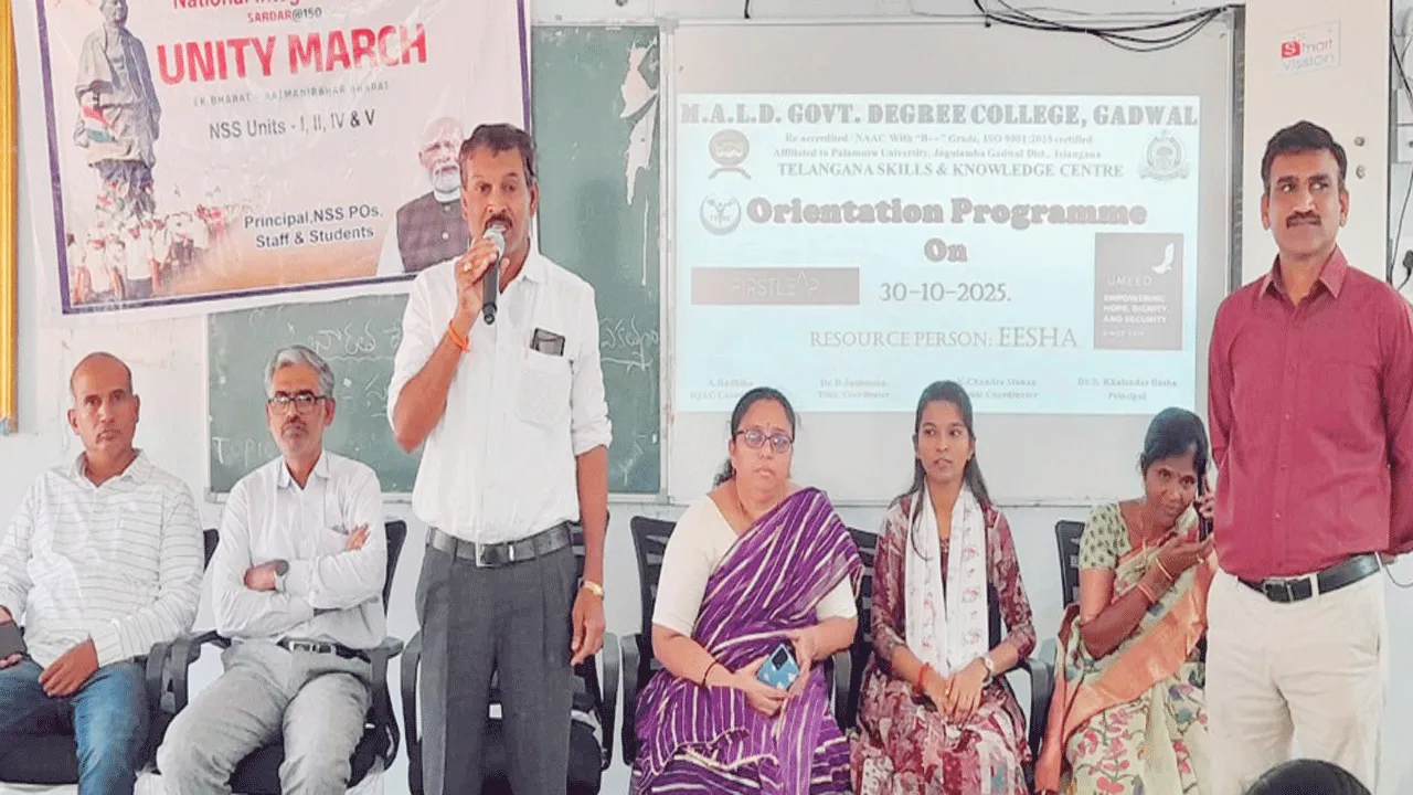 గద్వాల టౌన్, అక్టోబరు 30 (ఆంధ్రజ్యోతి): వృతి సంబంధ నైపుణ్యాల పెంపుకోసం సర్టిఫికె ట్ కోర్సు పట్ల అవగాహన పెంచుకోవాలని వైస్ ప్రిన్సిపాల్ డాక్టర్ చంద్రమోహన్ సూచిం చారు. తెలంగాణ స్కిల్ నాలెడ్జి సెంటర్ ఆధ్వ ర్యంలో ఉమిద్ ఫౌండేషన్ వారు డిగ్రీ తృతీయ సంవత్సరం విద్యార్థినుల కోసం గురువారం ప ట్టణంలోని ఎంఏల్డీ ప్రభుత్వ డిగ్రీ కళాశాలలో సర్టిఫికెట్ కోర్సులకు సంబంధించి ఓరియంటేష న్ కార్యక్రమం నిర్వహించారు. ఈ సందర్బం గా మాట్లాడిన వైస్ ప్రిన్సిపాల్, లైఫ్ స్కిల్స్, ఇం టర్వ్యూ స్కిల్స్, కమ్యూనికేషన్ స్కిల్స్స్ తదితర అంశాలపై సర్టిఫికెట్ కోర్సుల ద్వారా అవగాహ న పెంచుకుని నచ్చిన రంగాల్లో రాణించాలని సూచించారు. కార్యక్రమంలో మాట్లాడిన ఉమిద్ ఫౌండేషన్ రిసోర్స్పర్సన్ ఈష, ప్రోగ్రాం నెలరో జుల పాటు ఉంటుందన్నారు. నవంబరు 3వ తేదీ నుంచి ప్రారంభమయ్యే కోర్సులో వృత్తిప రమైన లక్ష్యాలను సాధించడంతో పాటు వారి కేరీర్ మార్గాలను నావిగేట్ చేసేందుకు మద్ద తుగా ఉండేందుకు కార్యక్రమాలను రూపొందిం చినట్లు తెలిపారు. విద్యార్థినులు అందరూ ఈ అవకాశాన్ని సద్వినియోగం చేసుకోవాలన్నారు. కార్యక్రమంలో కళాశాల టీఎస్కేసీ కోఆర్డినేటర్ డాక్టర్ డి.సత్తెమ్మ, మెంటార్ సుబ్రమణ్యం, ఐక్యూ ఏసీ కోఆర్డినేటర్ రాధిక, అధ్యాపకులు సురేందర్రెడ్డి, డాక్టర్ కె.సత్యన్న, డాక్టర్ వెంకటే శ్వరమ్మ, జిటి పద్మ, వినోద్, రమాదేవి ఉన్నారు.