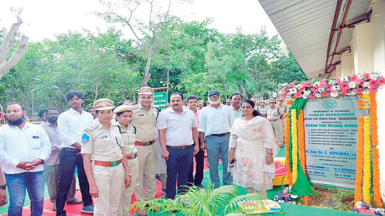 మహబూబ్నగర్, నవంబరు 2 (ఆంధ్రజ్యోతి) : నగరంలో అర్బన్ ఎకో పార్కులో ఇటీవల నగర్ వన్ యోజన ద్వారా రూ.2 కోట్లతో పలు అభివృద్ధి కార్యక్రమాలు చేపట్టామని ప్రిన్సిపల్ చీఫ్ కన్జర్వేటర్ ఆఫ్ ఫారెస్ట్ డా.సి సువర్ణ అన్నారు. ఆదివారం ఆమె అర్బన్ ఎకో పార్కును సందర్శించారు. బోటింగ్ ప్రదేశం వద్ద మొక్కలు నాటారు. ఈ సందర్భంగా ఆమె మాట్లాడుతూ పార్క్ అభివృద్ధి, సుందరీకరణ, పునరుద్ధరణ వంటి పనులు సందర్శకుల కోసం చేపట్టామన్నారు. నగర్ వన్ యోజన నిధులతో రూ.70 లక్షలతో రూఫ్టాప్ సోలార్ పవర్ ప్లాంట్, 11 సైకిళ్లు, పిల్లల ఆట పరికరాలు, టైగర్ ఫొటో పాయింట్ పునరుద్ధరణ, మరమ్మతులు, బటర్ ఫ్లై, కరెన్సీ పార్కు పునరుద్దరణ, సుందరీకరణ పనులు చేపడుతున్నారన్నారు. అక్కడ చేపడుతున్న పనులను ఫొటో ఎగ్జిబిషన్ ద్వారా తిలకించారు. అనంతరం పిల్లల మర్రిలో డీర్పార్క్, మినీ జూపార్క్, రాజరాజేశ్వర ఆలయం, మ్యూజియంను సందర్శించారు. మ్యూజియంలో సేకరించిన పురాతన విగ్రహాలు, నాణేలు, వస్తు సామగ్రిని తిలకించారు. కన్జవేటర్ ఆఫ్ ఫారెస్ట్ రాంబాబు, జిల్లా అటవీశాఖ అధికారి సత్యనారాయణ, ఎఫ్ఆర్వో ఎండీ అబ్దుల్ పాల్గొన్నారు.