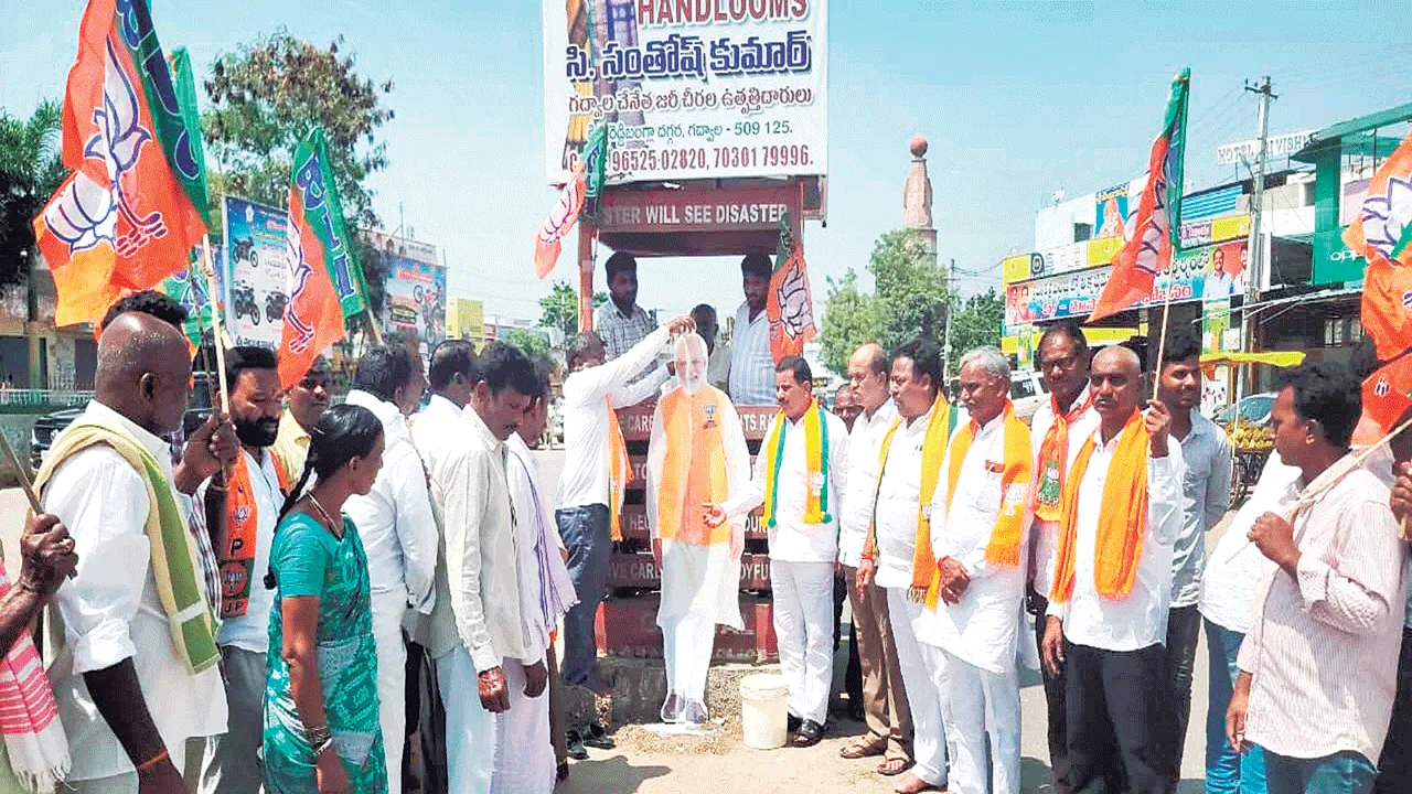 గద్వాల టౌన్, అక్టోబరు 12 (ఆంధ్రజ్యోతి): రైతుల ఆదాయాన్ని రెట్టింపు చేయడమే లక్ష్యం గా కేంద్రం ప్రభుత్వం కొత్తగా రూపొందించిన ‘ప్రధాన మంత్రి ధన్ ధాన్య కృషి యోజన’ (పీఎండీడీకేవై) సాగుదారులకు వరమని బీజేపీ జిల్లా అధ్యక్షుడు రామాంజనేయులు అన్నారు. పథకంలో ఉమ్మడి జిల్లాలోని గద్వాల, నారాయణపేట వెనుకబడిన జిల్లాలను చేర్చడం హర్షదాయకమన్నారు. నూతన పథకాన్ని స్వాగతిస్తూ ఆదివారం పట్టణంలోని పాతబస్టాండ్ సర్కిల్లో ప్రధాని మోదీ చిత్రపటానికి బీజేపీ నాయకులు క్షీరాభిషేకం చేశారు. ఈ సందర్బంగా మాట్లాడిన రామాంజనేయులు, కొత్త పథకంలో ఉమ్మడి జిల్లాకు అవకాశం కల్పించడంలో మహబూబ్నగర్ లోకసభ సభ్యురాలు డీకే అరుణ చేసిన కృషి కారణమని కృతజ్ఞతలు తెలిపారు. ఈ పథకం ఆధారంగా రైతులు పాడి, పవువులు, గొ ర్రెలు, కోళ్ల పెంపంకం వంటి సాగు అనుబంధ రంగాలపై దృష్టిసారించి అధిక ఆదాయాన్ని దక్కించుకోవాలని ఆకాంక్షించారు. కార్యక్రమం లో బండల వెంకట్రాములు, అక్కల రమాదేవి, శ్యాంరావు, మీర్జాపురం రామచంద్రా రెడ్డి, బలి గెర శివారెడ్డి, రజక జయశ్రీ, వెంకటేశ్వర్ రెడ్డి, దేవదాస్, గాంజ సాయి, తిమ్మన్న, వివిధ మం డలాల నాయకులు నాగరాజు, నరేష్గౌడ్, బాలేశ్వర్రెడ్డి, అశోక్ రెడ్డి, జయరాములు, నర సింహులు, పాపిరెడ్డి, దేవేందర్ రెడ్డి, బుచ్చన్న, వెంకటస్వామి, బాబు ఉన్నారు.