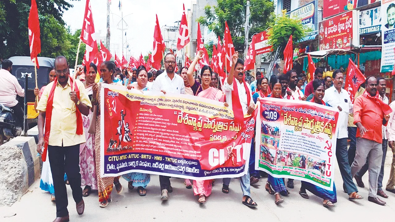 నాలు గు లేబర్కోడ్లకు వ్యతిరేకంగ బుధవారం సార్వ త్రిక సమ్మెలో భాగంగా జిల్లా కేంద్రంలో సీఐటీ యూ, టీయూసీఐ, ఏఐటీయూసీ, ఐఎన్టీ యూసీ, టీఎన్టీయూసీ ఆధ్వర్యంలో పట్టణంలో భారీ ర్యాలీ, అనంతరం మునిసిపల్ ఆవరణలో సభ ఏర్పాటు చేశారు.