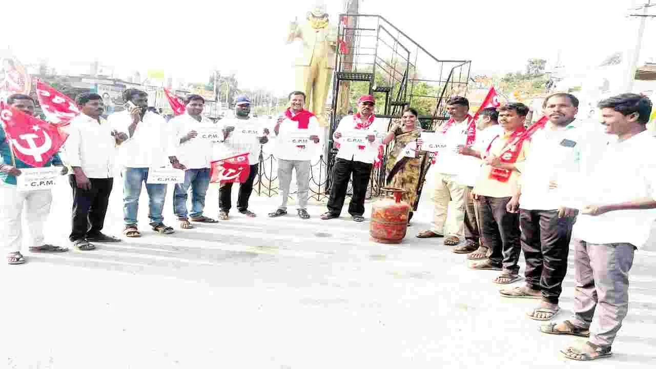 నారాయణపేట/మక్తల్/ దామరగిద్ద, ఏప్రిల్ 10 (ఆంధ్రజ్యోతి): కేంద్ర ప్రభుత్వం పెంచిన గ్యాస్ సిలిండర్ ధరను వెంటనే తగ్గించాలని సీపీఎం జిల్లా కార్యదర్శి వెంకట్రామిరెడ్డి డిమాండ్ చేశారు. గురువారం నారాయణపేట అంబేడ్కర్ చౌరస్తాలో గ్యాస్ సిలిండర్తో నాయకులు నిరసన వ్యక్తం చేశారు. ఈ సందర్భంగా ఆయన మాట్లాడుతూ అంతర్జాతీయ స్థాయిలో చమురు ధరలు తగ్గితే ఏ దేశంలోనైనా గ్యాస్, పెట్రోల్ ధరలు తగ్గుతాయని కానీ భారతదేశంలో మాత్రం భిన్నంగా ధరలు పెంచారని విమర్శించారు. బీజేపీ అధికారంలోకి వచ్చిన సమయంలో రూ.400 ఉన్న గ్యాస్ నేడు వెయ్యి రూపాయలకు చేరిందన్నారు. కార్యక్రమంలో గోపాల్, అం జిలయ్యగౌడ్, కాశప్ప, దస్తప్ప, ప్రకాశ్, భీంశప్ప, మల్లేష్, గోవింద్, రాములు, పవన్, రాజేశ్వరి తదితరులున్నారు.