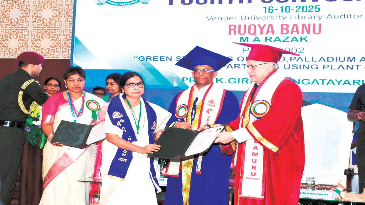 యూనివర్సిటీకి ఉదయం 11 గంటలకు గవర్నర్ జిష్ణుదేవ్ వర్మ చేరుకున్నారు. యూనివర్సిటీ వీసీ శ్రీని వాస్, కలెక్టర్ విజయేందిర బోయి, మన్నె సత్యనారాయణరెడ్డి, ఎస్పీ జానకి, రిజిస్టార్ పూస రమే ష్ బాబు గవర్నర్కు పూల బొకేతో ఘనస్వాగతం పతి కారు. పొలీసులు గవర్నర్కు గౌరవ వందనం చేశారు. అధికారులు మర్యాదపూర్వకంగా వర్సిటీ లాంఛనాలతో స్నాతకోత్సవ కార్యక్రమానికి చేరుకున్నారు. అనంతరం వర్సిటీ టాపర్లు 12 మందికి పీహెచ్డీ పట్టాలు, 83 మందికి బంగారు పతకాలు, 2,809 మందికి పీజీ, 18,666 మందికి యూజీ డిగ్రీలు అందజేశారు. ఉద యం 11.10కి మొదలైన కార్యక్రమం మఽధ్యాహ్నం 12.30కి పూర్తికాగానే, తిరిగి మరోసారి పోలీసులు గవ ర్నర్కు గౌరవ వందనం సమర్పించారు.