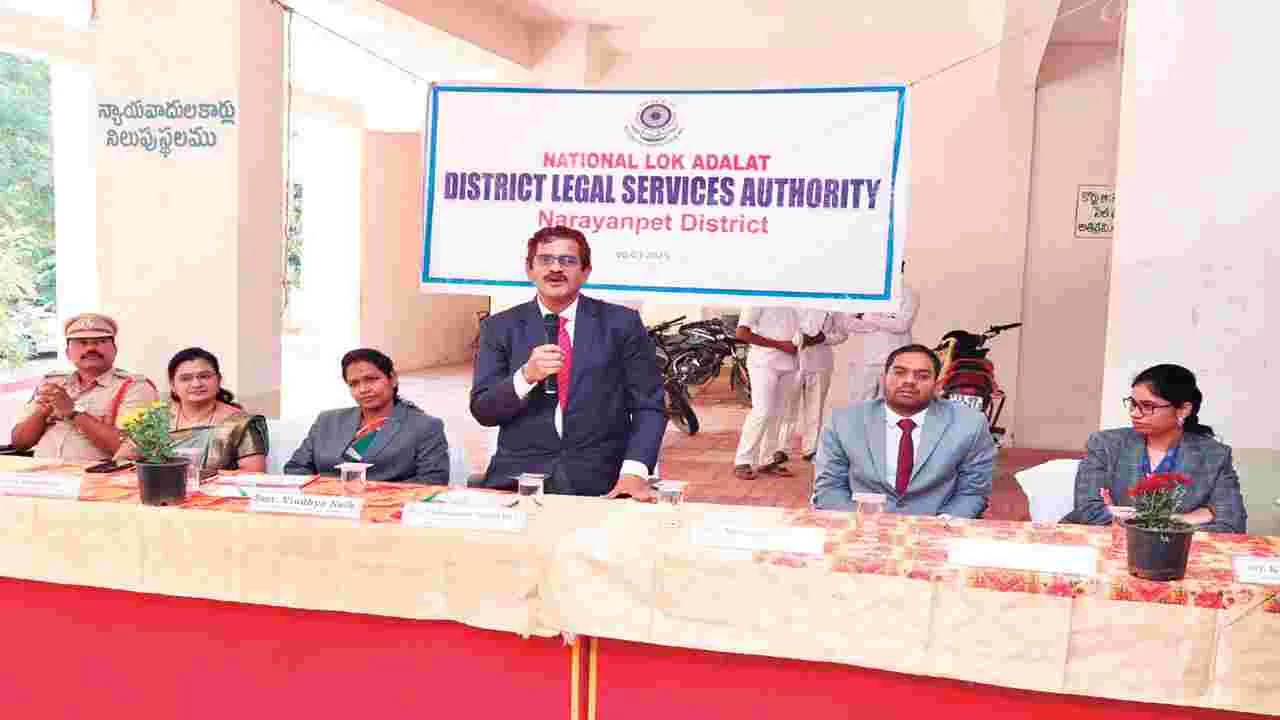 నారాయణపేటటౌన్, మార్చి 8 (ఆంధ్రజ్యోతి): ప్రజలకు సేవ చేయడం మన కర్తవ్యమని, ప్రజలు తమకు అండగా నిలిచి సహకరించాలని జిల్లా ప్రధాన న్యాయాధికారి మహమ్మద్ అబ్దుల్రఫీ కోరారు. శనివారం లోక్ అదాలత్ కార్యక్రమంలో డీఎల్ఎస్ఏ కార్యదర్శి సీనియర్ సివిల్ న్యాయాధికారి వింద్యనాయక్, జూనియర్ సివిల్ న్యాయాధికారి మహమ్మద్ ఉమర్, అడిషనల్ జూనియర్ సివిల్ న్యాయాధి కారి జకియాసుల్తానా, అసిస్టెంట్ పబ్లిక్ ప్రాసి క్యూటర్ సురేష్కుమార్, పబ్లిక్ ప్రాసిక్యూటర్ ఆకుల బాలప్ప, లీగల్ ఎయిడ్ డిఫెన్స్ కౌన్సిల్ కె.లక్ష్మిపతిగౌడ్, నాగేశ్వరి, ఇతర న్యాయవాదులు కలిసి లోక్ అదాలత్కు వచ్చిన వివిధ రకాల కేసులను రాజీమార్గం ద్వారా పరిష్కరించారు. లోక్ అదాలత్లో నారాయణపేట జిల్లా కోర్టు పరిధిలో 9,825 కేసులను రాజీ మార్గం ద్వారా పరిష్కరించారు. జిల్లాలో 14 పోలీస్స్టేషన్లతో పాటు రెండు ఎక్సైజ్ పోలీస్స్టేషన్ల పరిధిలో ఉ న్న కేసులకు న్యాయవాదులు సహకరించి పరి ష్కారానికి కృషి చేశారు. ఈ సందర్భంగా రాజీ అయిన వ్యక్తులకు జిల్లా ప్రధాన న్యాయమూర్తి మొక్కను అందజేసి, అభినందించారు. మొత్తం కేసుల పరిష్కారానికి గాను రూ.24,08,020 ఆదాయం ప్రభుత్వానికి సమకూరిందని ప్రధాన న్యాయమూర్తి తెలిపారు. ఈ సందర్భంగా సీని యర్ సివిల్ న్యాయాధికారి, డీఎల్ఎస్ఏ కార్య దర్శి వింద్యనాయక్ మాట్లాడుతూ ఇరువురు అ వగాహనతో కేసులను రాజీ చేసుకుని సంతోషం గా ఉండాలని సూచించారు. జూనియర్ సివిల్ న్యాయాధికారి మహమ్మద్ ఉమర్ మాట్లాడు తూ లోక్ అదాలత్ మంచి అవకాశమని, లోక్ అదాలత్లో చిన్నచిన్న కేసులను క్షమించి రాజీ కావడం వల్ల ఇరువురికి సంతోషంగా ఉంటుంద న్నారు. సివిల్, తదితర కేసుల్లో ఒకరికొకరు రా జీ కావడం వల్ల కేసులు పరిష్కారం అవుతా యని, ఇద్దరూ గెలుస్తారని అన్నారు. పీపీ బాల ప్ప మాట్లాడుతూ ప్రతీ రెండు నెలలకోసారి జా తీయ లోక్ అదాలత్ జరుగుతుందన్నారు. ఆర్థిక స్థోమత లేనివారి కేసులను ఉచితంగా వాదించ డానికి న్యాయవాదులను నియమిస్తుందని డిఫె న్స్ కౌన్సిల్ లక్ష్మిపతిగౌడ్ తెలిపారు. కార్యక్ర మంలో న్యాయవాదులు, కక్షిదారులు, కోర్టు సిబ్బంది పాల్గొన్నారు.