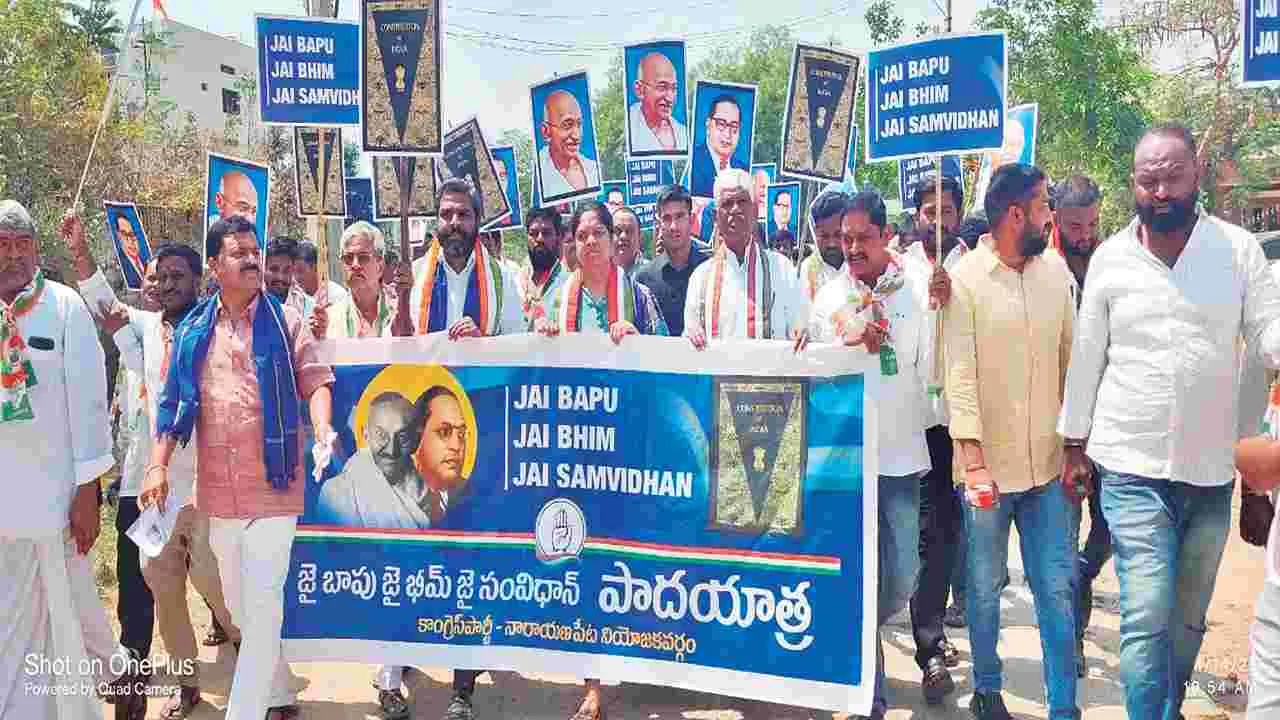 ఏఐసీసీ, టీపీసీసీ ఆదేశాల మేరకు జైభీమ్ జైబాపు జైసంవిధాన్ పాదయాత్రను నారాయణపేటలో సోమవారం ఎమ్మెల్యే చిట్టెం పర్ణికారెడ్డి, కాంగ్రెస్ పార్టీ జిల్లా అధ్యక్షుడు ప్రశాంత్రెడ్డి చేపట్టారు.