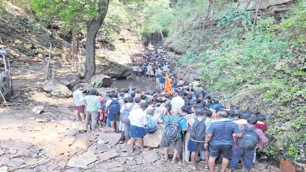 అచ్చంపేట, ఏప్రిల్ 11 (ఆంధ్రజ్యోతి): ప్రతీ ఏటా చైత్ర పౌర్ణమికి భక్తులకు దర్శనమిచ్చే సలేశ్వరం లింగమయ్య స్వామిని దర్శించుకునేందుకు రెండు తెలుగు రాష్టాల నుంచే కాకుండా కర్ణాటక, మహారాష్ట తదితర రాష్టాల నుంచి పెద్ద ఎత్తున భక్తులు తరలి వస్తుంటారు. శుక్రవారం నుంచి అటవీ దారులు తెరుచుకోవడంతో పెద్ద సంఖ్యలో భక్తులు, పర్యాటకులు తరలి వెళుతున్నారు. పరహాబాద్ చౌరస్తా నుంచి దాదాపు 18 కిలోమీటర్ల దూరం దట్టమైన అటవీ మార్గంలో వెళ్లాల్సి ఉంటుంది. రాంపూర్ పెంట వరకు వాహనాలలో వెళ్లి అక్కడి నుంచి మోకాళ్ల కురువ ప్రాంతం వరకు ఆటోలో వెళ్తారు. అక్కడినుంచి కాలినడకన మహిమాన్విత లింగమయ్య స్వామిని దర్శించుకుంటున్నారు. మొదటి రోజు అన్నిదారులు సలేశ్వరం వైపే అన్నట్లుగా పెద్ద ఎత్తున ద్విచక్ర వాహనాలు, ఆటోలు, కార్లు, బస్సులు తరలివెళుతున్నాయి. అధికా రులు దీనికి అనుగుణంగా ఏర్పాట్లను చేశారు. అనారోగ్య సమస్యలు ఉన్నవా రు తగు జాగ్రత్తలు తీసుకోవాలని వైద్యులు సూచిస్తున్నారు. పరహాబాదు, రాంపూర్, మోకాళ్ల కురువ వద్ద ప్రత్యేక శిబిరాలను ఏర్పాటు చేసి వైద్య సేవలు అందిస్తున్నారు. ఆర్అండ్బీ అధికారులు మహిళలకు ప్రత్యేకంగా మరుగుదొడ్లు, మూత్రశాలలు ఏర్పాటు చేశారు. మోకాళ్ల కురువ సమీపంలో అన్నప్రసాదాల పంపిణీకి వివిధ స్వచ్ఛంద సంస్థల వారు ఏర్పాట్లు చేశారు.
