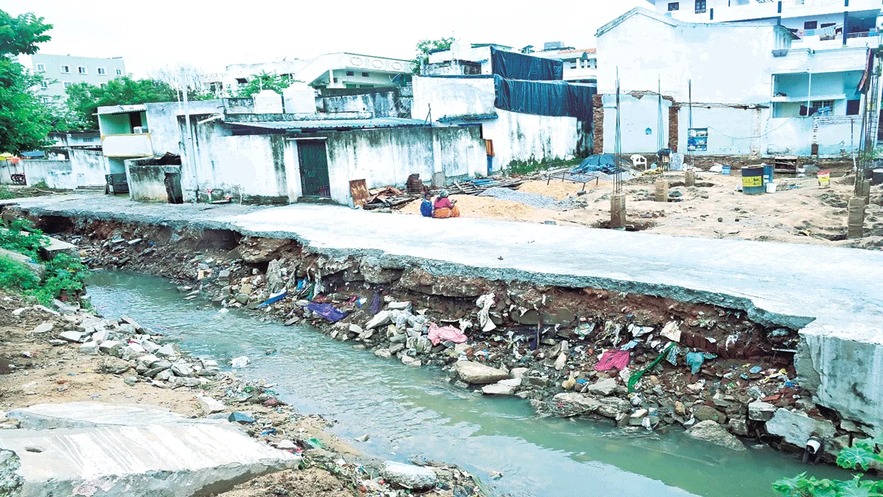 మహబూబ్నగర్, జూలై 25 (ఆంధ్రజ్యోతి): నగరంలోని బాయమ్మతోట వ ద్ద ఇటీవల వేసిన రోడ్డు కోతకు గురైంది. గాం డ్లోనికుంట నుంచి వచ్చే వరద నీటిని బాయ మ్మతోట నాలా ద్వారా పెద్దచెరువులోకి మళ్లి స్తారు. అయితే 20 అడుగలు మేర ఉంటే ఈ నాలా కబ్జాలకు గురవుతూ వచ్చింది. ప్రస్తు తం 5-6 అడుగులు మాత్రమే మిగిలింది. ఇటీ వల ఈ నాలా పక్కనే ఇటీవలే సీసీ రోడ్డును వేశారు. ఇటీవల కురిసిన భారీ వర్షాలను నా లానుంచి పెద్దఎత్తున వరద ప్రవహించింది. నాలా కుచించుకుపోవడంతో నీటి ప్రవాహ నం ఎక్కువగా ఉండటంతో పక్కనే వేసిన సీ సీ రహదారి కోతకు గురై కొట్టుకుపోయింది. మళ్లీ అధిక వర్షాలు కురిస్తే తమ ఇళ్లలోకి నీ రు చేరుతుందని స్థానికులు ఆందోళన చెం దుతున్నారు.
