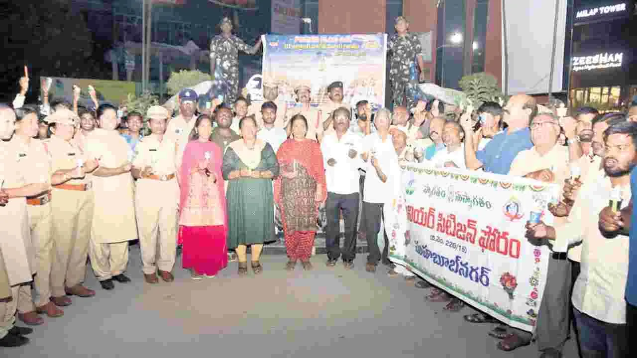 పోలీసు అమరవీరుల స్మారక వారోత్సవాలలో భాగంగా ఆదివారం రాత్రి మహబూబ్నగర్ పట్టణంలోని పరదేశి నాయుడు సర్కిల్ నుండి క్లాక్ టవర్ సర్కిల్ వరకు జిల్లా పోలీసుల ఆధ్వర్యంలో కొవ్వొత్తుల ర్యాలీ నిర్వహించారు. మానవహారం నిర్మించారు. కార్యక్రమంలో అదనపు ఎస్పీ ఎన్బీ రత్నం, డీఎస్పీ వెంకటేశ్వర్లు పాల్గొని అమరులకు నివాళి అర్పించారు. సీనియర్ సిటిజన్ ఫోరం ఆధ్వర్యంలో వన్టౌన్ పోలీస్ స్టేషన్ నుంచి గడియారం చౌరస్తా వరకు కొవ్వొత్తుల ర్యాలీని నిర్వహించారు.