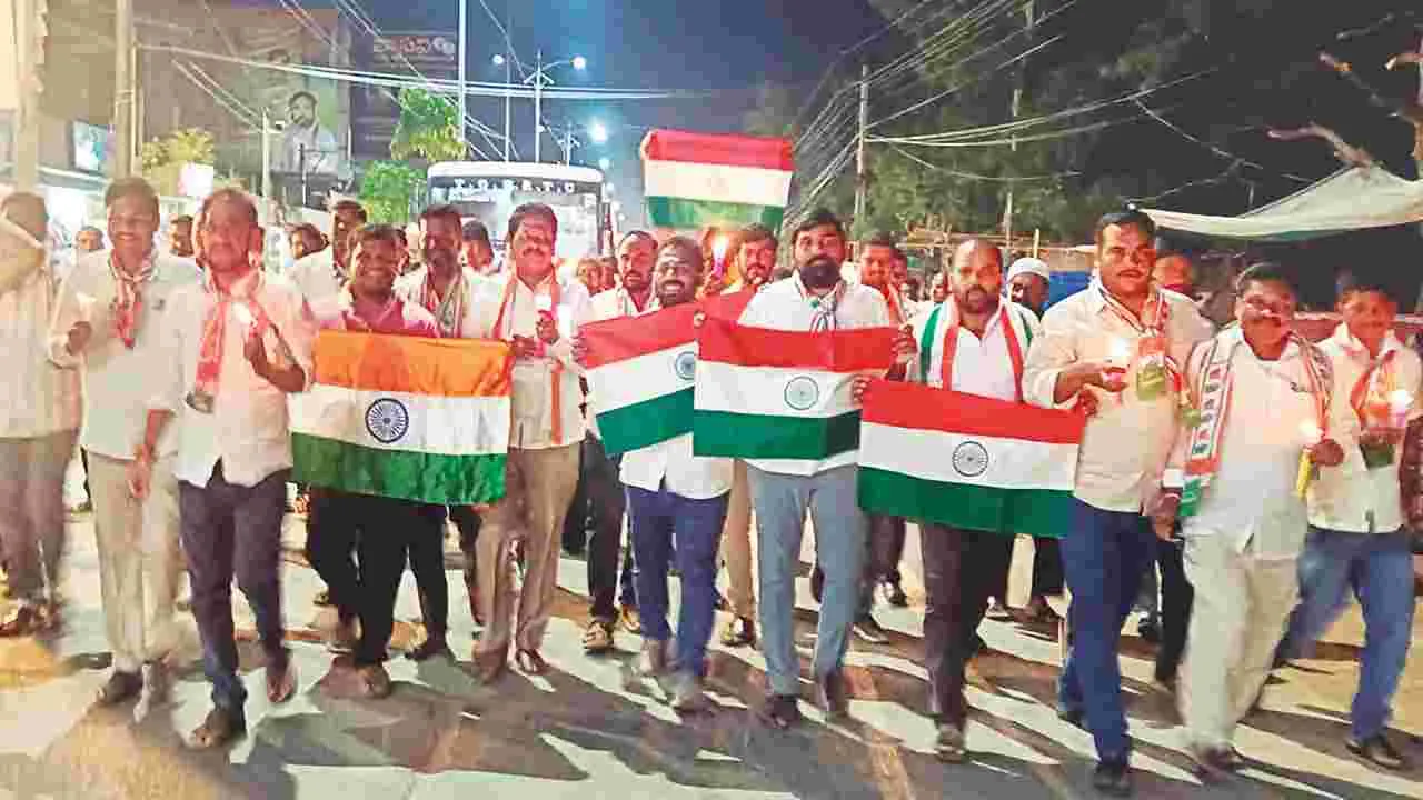 - కల్వకుర్తి పట్టణంలో కాంగ్రెస్ పార్టీ ఆ ధ్వర్యంలో శనివారం కశ్మీర్లో ఉగ్రవాదుల దాడి ని నిరసిస్తూ కొవ్వొత్తుల ర్యాలీ నిర్వహించారు. అనంతరం అంబేడ్కర్ విగ్రహం ముందు కొవ్వొ త్తుల ప్రదర్శన చేశారు. ఈ సందర్భంగా కాంగ్రె స్ రాష్ట్ర నాయకుడు, కల్వకుర్తి మాజీ సర్పంచ్ బృంగి ఆనంద్కుమార్ మాట్లాడారు. మార్కెట్ డైరెక్టర్ రమాకాంత్రెడ్డి, నాయకులు శ్రీకాంత్రె డ్డి, గోరటి శ్రీను, జగన్ తదితరులు ఉన్నారు.