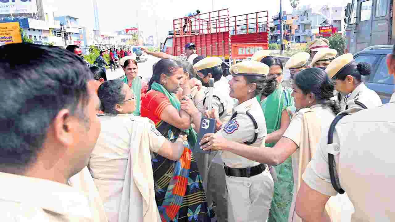 చౌటుప్పల్ టౌన్, భువనగిరి రూరల్, జనవరి 9(ఆంధ్రజ్యోతి): భూమికి భూమి ఇచ్చి, బహిరంగ మార్కెట్ ప్రకారం పరిహారం చెల్లించాలని త్రిపుల్ఆర్ నిర్వాసితులు డిమాండ్ చేశారు. గురువారం చౌటుప్పల్ పట్టణంలోని 65వ నెంబరు జాతీయ రహదారిపై త్రిపుల్ ఆర్ నిర్వాసితులు ఐదారు నిమిషాలపాటు రాస్తారోకో చేశారు. దీంతో జాతీయ రహదారిపై రెండు కిలోమీటర్ల మేర వాహనాలు నిలిచిపోయాయి. వెంటనే అప్రమత్తమైన పోలీసులు హైవేపై భైఠాయించిన భూ నిర్వాసితులను తొలగించి 10 నిమిషాల్లో వాహనాల రాకపోకలకు మార్గం సుగమం చేశారు. దీంతో ఆందోళనకు వచ్చిన మహిళలు విధుల్లో ఉన్న మహిళా పోలీ్సలతో వాగ్వాదానికి దిగారు. చౌటుప్పల్ సీఐ మన్మథకుమార్ ఆధ్వర్యంలో పోలీసులు నిర్వాసితులను అక్కడినుంచి శాంతి యుతంగా పంపించి వేశారు. అంతకుముందు ఆర్డీవో కార్యాలయం ఎదుట చౌటుప్పల్, వలిగొండ మండలాలకు చెందిన త్రిపుల్ఆర్ నిర్వాసితులు రెండు గంటలపాటు ధర్నా నిర్వహించారు. ఈ సందర్భంగా వారు మాట్లాడుతూ త్రిపుల్ఆర్లో కోల్పోయే భూమికి భూమి ఇవ్వాలని, లేదంటే బహిరంగ మార్కెట్ విలువ ప్రకారం పరిహారం చెల్లించాలన్నారు. లేదంటే అలైన్మెంట్ మార్చాలని భూ నిర్వాసితులు డిమాండ్చేశారు. ఆర్డీవో కార్యాలయం వద్ద భారీగా పోలీసులను మొహరించడంతో భూ నిర్వాసితులు ఆగ్రహం వ్యక్తంచేశారు. కార్యక్రమాల్లో యాదాద్రి భువనగిరి జిల్లా చౌటుప్పల్ పీఏసీఎస్ చైర్మన్ చింతల దామోదర్రెడ్డి, సీపీఎం జిల్లా కార్యదర్శి వర్గ సభ్యుడు బూరుగు కృష్ణా రెడ్డి, రైతు సంఘం జిల్లా అధ్యక్షుడు మేక అశోక్ రెడ్డి, భూ నిర్వాసితుల ఐక్య వేదిక ఆర్గనైజర్ దబ్బటి రామ్ గౌడ్, భూ నిర్వాసితులు జి. సురేందర్ రెడ్డి, సందగళ్ల మల్లేశ్, జాల వెంకటేశ్, మారుపాక లింగం తదితరులు పాల్గొన్నారు. ఇదిలా ఉండగా ఆర్ఆర్ఆర్ నిర్మాణానికి మా భూములు ఇచ్చే ప్రసక్తే లేదని, మొదటి గెజిట్ అలైన్మెంట్ ప్రకారమే ఆర్ఆర్ఆర్ నిర్మాణం చేపట్టాలని నిర్వాసిత రైతు ప్రతినిధులు తంగెళ్లపల్లి రవికుమార్, అవిశెట్టి పాండు యాదవ్, కె.భద్రయ్య, ధర్మేశ్ డిమాండ్ చేశారు.