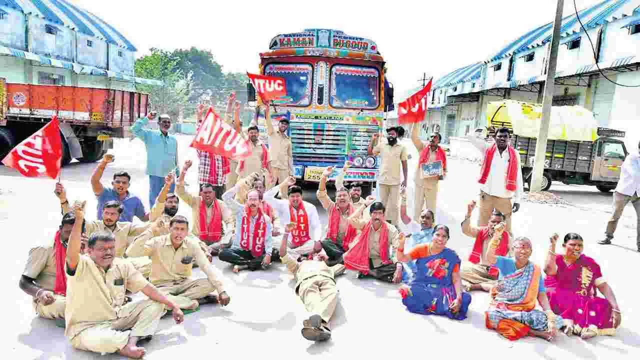 భువనగిరి రూరల్, జనవరి7(ఆంధ్రజ్యోతి): చౌక ధరల దుకాణాలకు తరలిస్తున్న రేషన్ బియ్యాన్ని హమాలీ కార్మికులు మంగళవారం అడ్డుకున్నారు. భువనగిరి మార్కె ట్ యార్డులోని ఎంఎల్ఎస్ గోదాం వద్ద మంగళవారం బీహార్కు చెందిన ప్రైవేటు హమాలీల ద్వారా రేషన్ షాపులకు తరలిస్తున్న లారీలను సమ్మె చేస్తున్న సివిల్ సప్లయి కార్మికులు అడ్డుకున్నారు. బియ్యాన్ని తరలించకుండా లారీలకు అడ్డంగా నిలబడి ప్రభుత్వానికి వ్యతిరేకంగా నినాదాలు చేశారు. దీంతో సివిల్ సప్లయి కార్మికులు అధికారుల మధ్య తీవ్ర ఉద్రిక్తం నెలకొన్నది. సమాచారం అందుకున్న పోలీసులు అక్కడికి చేరుకుని ఆందోళనకారులను బుజ్జగించినప్పటికీ ససేమిరా అన్నారు. గత ఏడు రోజులనుంచి ప్రజాస్వామ్యబద్దంగా నిరవధిక సమ్మె చేస్తున్నా పట్టించుకోకుండా, తమ సమ్మెను భగ్నం చేయడం సరికాదన్నారు. విషయం తెలుసుకున్న భువనగిరి పట్టణ ఎస్హెచ్వో సురేశ్ కుమార్ ఘటనా స్థలానికి చేరుకొని ఆందోళనకారులతో మాట్లాడారు. ఎట్టకేలకు సమస్య సద్దుమనిగింది. కార్యక్రమంలో ఏఐటీయూసీ జిల్లా ప్రధానకార్యదర్శి ఎండీ ఇమ్రాన్, గనబోయిన వెంకటేశ్, సామల శోభన్ బాబు, హమాలీ యూనియన్ నాయకులు శ్రీనివాస్, బస్వయ్య, జగన్ పాల్గొన్నారు.
