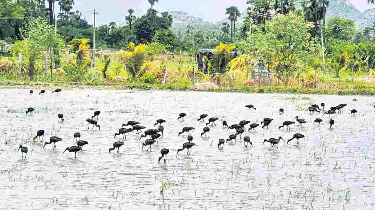 భూదానపోచంపల్లి మండలం జలాల్పూర్ గ్రామశివారులోని వరి పొలంలో గురువారం నల్లకొంగలు కనువిందుచేశాయి. సంతానోత్పత్తి కోసం ఉష్ణమండల దేశాలకు వలస వస్తున్న నల్లకొంగలు-చిత్తడి నేలలు, సరస్సులు, నదులలో ఉండే ందుకు ఇష్టపడతాయి. వీటి శాస్త్రీయ నామం ‘సికోనియా నిగ్రా’. ఇవి వరి క్షేత్రాల్లోని కీటకాలను ఆహారంగా స్వీకరిస్తూ రైతు నేస్తాలుగా నిలుస్తున్నాయి.