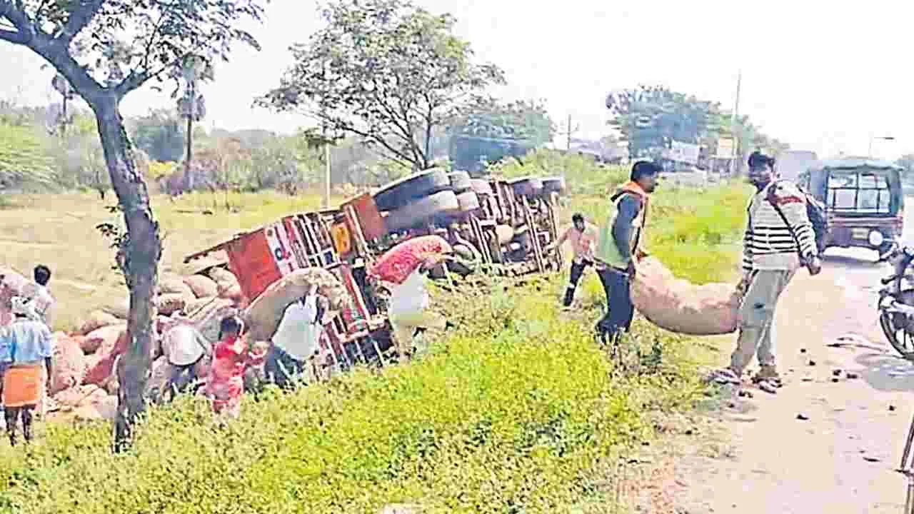 Onion Laden Lorry Tips: ఉల్లి లారీ బోల్తా.. బస్తాలు ఎత్తుకెళ్లిన స్థానికులు!