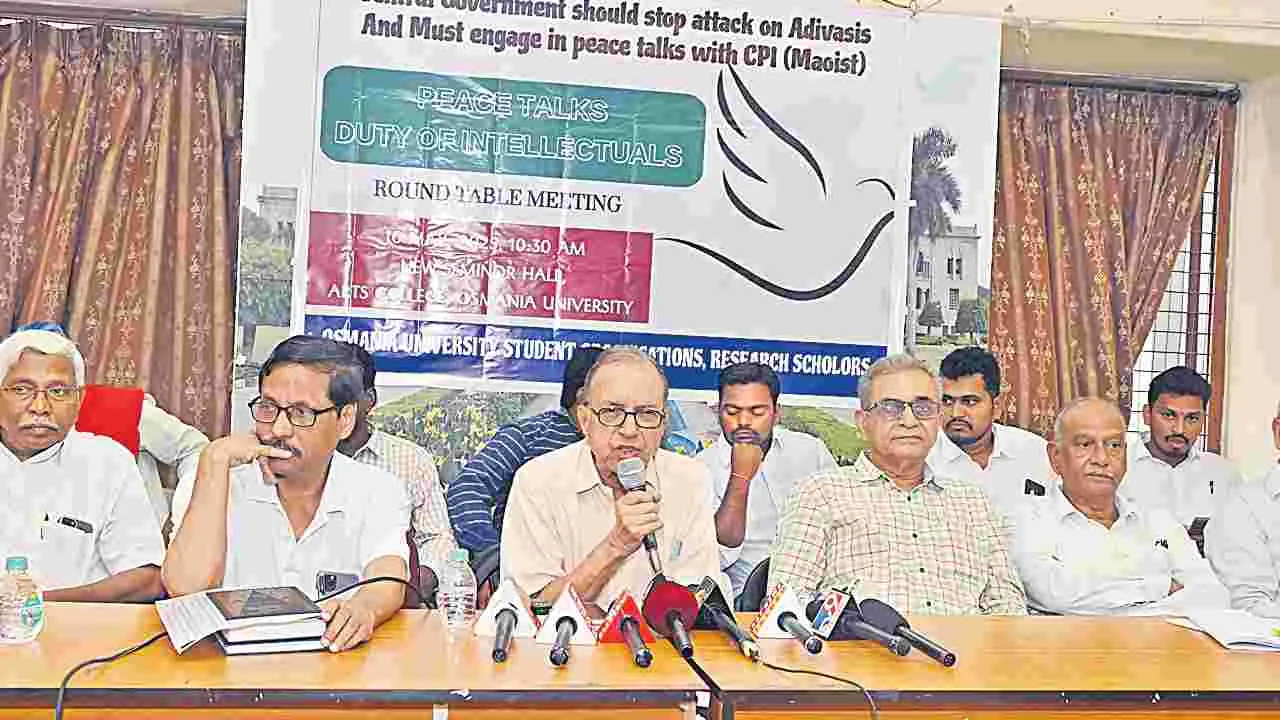 హైదరాబాద్ సిటీ, ఉస్మానియా యూనివర్సిటీ, మే 16(ఆంధ్రజ్యోతి): ఆపరేషన్ కగార్ పేరుతో మోదీ ప్రభుత్వం దేశ పౌరులపై యుద్ధం చేయడం సరికాదని ఓయూ విద్యార్థి సంఘాలు ఆర్ట్స్ కాలేజీ సెమినార్ హాల్లో నిర్వహించిన రౌండ్ టేబుల్ సమావేశంలో మేధావులు, విద్యావంతులు అభిప్రాయపడ్డారు. మావోయిస్టు పార్టీతో కేంద్రం చర్చలు సాగించాలని ఆచార్య హరగోపాల్ కోరారు. మారణహోమాన్ని ఆపడానికి కేంద్ర హోంశాఖ సహాయమంత్రి బండి సంజయ్ ప్రయత్నించాలని శాంతి చర్చల కమిటీ అధ్యక్షుడు జస్టిస్ చంద్రకుమార్ విజ్ఞప్తిచేశారు. ఎమ్మెల్సీ కోదండరాం మాట్లాడుతూ ముందుగా కేంద్ర ప్రభుత్వం కాల్పుల విరమణ ప్రకటన చేయాలన్నారు. కర్రెగుట్టల్లో మోహరించిన సైనిక బలగాలను వెనక్కి పిలిపించారే గానీ, ఆపరేషన్ కగార్ను మాత్రం కొనసాగిస్తున్నారని పౌరహక్కుల సంఘం అధ్యక్షుడు ప్రొ. గడ్డం లక్ష్మణ్ ఆవేదన వ్యక్తం చేశారు. 16 నెలల్లో 500 మందికి పైగా మృతిచెందారని చెప్పారు.