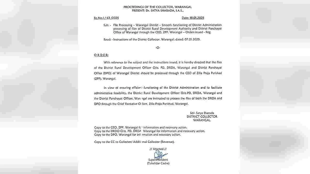 ఒక శాఖకు చెందిన జిల్లా స్థాయి అధికారి తనకు సంబంధం లేని మరో శాఖకు చెందిన జిల్లా స్థాయి అధికారి వద్దకు పైళ్లు తీసుకెళ్లాల్సిరావడం ఏమిటని ఇతర అధికారులు ప్రశ్నిస్తున్నారు. జడ్పీ సీఈవో రాంరెడ్డి గతంలో జనగామ డీఆర్డీఏగా పని చేశారు. కాగా, వరంగల్ డీఆర్డీఏగా పనిచేసిన కౌసల్యాదేవి కన్నా ఆయన జూనియర్. దీంతో తన కన్నా జూనియర్ వద్దకు ఫైళ్లు తీసుకెళ్లడమేంటని కౌసల్యాదేవి ప్రశ్నించడంతో ఆమెపై పైఅధికారులకు తప్పుడు నివేదికలు ఇచ్చి బదిలీ చేయించారనే ఆరోపణలున్నాయి. ఖాళీ అయిన ఆ స్థానంలో డీఆర్డీఏ ఇన్చార్జిగా రాంరెడ్డినే కలెక్టర్ నియమించారు. ఇక కలెక్టర్ ఇచ్చిన ఉత్తర్వులతో జడ్పీ సీఈవో తన పరిధిని మించి అన్ని శాఖల్లో జోక్యం చేసుకుంటూ షాడో కలెక్టర్గా మారారనే ప్రచారం జరుగుతోంది. ఏకంగా వైద్యశాఖపై కలెక్టరేట్లో సీఈవో సమీక్ష నిర్వహించారు. విద్యాశాఖ, రెవెన్యూ శాఖ, మహిళా, శిశు సంక్షేమ శాఖ.. ఇలా అన్ని శాఖల ఫైళ్లకూ తొలుత సీఈవో వద్ద ఆమోదముద్ర వేయించుకున్నాకే.. కలెక్టర్ వద్దకు వెళ్లాల్సిన పరిస్థితి నెలకొందని అధికారులు వాపోతున్నారు. గ్రీవెన్స్లో వచ్చే ఫైళ్లను సైతం సీఈవో అనుమతి ఉంటేనే పరిష్కరిస్తున్నారని చెబుతున్నారు. ఇదిలా ఉండగా.. ధరణిలో జరిగిన తప్పులను పరిష్కరించాలంటూ వస్తున్న బాధితులకు గేటు వద్దే సీఈవో చెక్ పెడుతున్నారనే ఆరోపణలున్నాయి. రెవెన్యూశాఖ మంత్రి పొంగులేటి శ్రీనివా్సరెడ్డి ఆదేశించినా కలెక్టరేట్లో ఫైల్ ముందుకు కదలడం లేదని చెబుతున్నారు. దేశాయిపేటకు చెందిన ఓ వ్యక్తి వ్యవసాయ భూమి వివాదాన్ని పరిశీలించి పరిష్కరించాలని మంత్రి ఆదేశించగా.. సీఈవో అనుమతి లేనందునే పరిష్కారం కాలేదని పేర్కొంటున్నారు. ఈ విషయంపై పలువురు ప్రభుత్వ ప్రధాన కార్యదర్శి రామకృష్ణారావుకు ఫిర్యాదు చేసినట్లు, దీంతో జడ్పీ సీఈవోకు లేని అధికారాలు కల్పించిన కలెక్టర్ను సీఎ్సను మందలించినట్లు తెలిసింది.