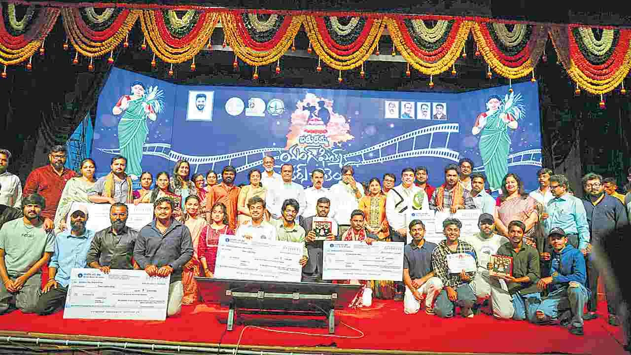 రవీంద్రభారతి, డిసెంబరు 29 (ఆంధ్రజ్యోతి): మారుమూల గ్రామాలకు చెందిన ప్రతిభావంతులను ప్రపంచానికి పరిచయం చేసేందుకే రాష్ట్రప్రభుత్వం తెలంగాణ ఫిలిం డెవల్పమెంట్ కార్పొరేషన్ (ఎఫ్డీసీ) ఆధ్వర్యంలో బతుకమ్మ యంగ్ ఫిలిం మేకర్స్ ఛాలెంజ్ -2025ను నిర్వహించిందని మంత్రి కోమటిరెడ్డి వెంకట్రెడ్డి తెలిపారు. తెలంగాణ భవిష్యత్తును కళాత్మక దృష్టితో మరింత గొప్పగా తీర్చిదిద్దేందుకు కృషి జరగాలని ఆకాంక్షించారు. బతుకమ్మ యంగ్ ఫిలిం మేకర్స్ ఛాలెంజ్ -2025 అవార్డుల ప్రదానోత్సవం సోమవారం రవీంద్రభారతిలో ఘనంగా జరిగింది. కార్యక్రమానికి మంత్రులు కోమట్టిరెడ్డి, జూపల్లి కృష్ణారావు, ఎఫ్డీసీ చైర్మన్ దిల్ రాజు, ఎఫ్డీసీ ఎండీ ప్రియాంక, ప్రముఖ సినీ దర్శకులు దశరథ్, హరీష్ శంకర్, నటులు తనికెళ్ల భరణి, అశోక్కుమార్, గాయకులు రాహుల్ సింప్లిగంజ్, మంగ్లీ, మోహన భోగరాజు, సంగీత దర్శకుడు చరణ్ అర్జున్, రచయిత్రి అయినంపూడి శ్రీలక్ష్మి తదితరులు హాజరయ్యారు. ఈ సందర్భంగా మంత్రి కోమటిరెడ్డి మాట్లాడుతూ.. దేశంలో ఎక్కడా లేని విధంగా ఒక అద్భుతమైన ప్రయోగానికి తమ ప్రభుత్వ శ్రీకారం చుట్టిందని తెలిపారు. మంత్రి జూపల్లి కృష్ణారావు మాట్లాడుతూ.. తెలంగాణ వీరత్వానికి, కళలకు పురిటిగడ్డ అని అన్నారు. దిల్ రాజు మాట్లాడుతూ.. ప్రభుత్వ పథకాలు, సంక్షేమం, ప్రజాపాలనను యంగ్ ఫిలిం మేకర్స్ తమ కెమెరా కళ్లతో చూశారని ప్రశంసించారు. ఈ ఛాలెంజ్లో 500లకు పైగా చిత్రాలు పోటీ పడగా.. షార్ట్ ఫిలిం విభాగంలో మొదటి బహుమతి సరస్సు జ్ఞాపకాలు, రెండో బహుమతి సొంతిల్లు, మూడో బహుమతి ఆత్మ గౌరవం చిత్రాలకు దక్కాయి. బతుకమ్మ పాటల విభాగంలో మొదటి మూడు స్థానాల్లో బతుకమ్మ సాంగ్, బతుకమ్మ సంబురాలు, అకాశం అంచులు దాటి పాటలు నిలిచాయి. మొదటి బహుమతి కింద రూ.3 లక్షలు, రెండో బహుమతి కింద రూ.2 లక్షలు, మూడో బహుమతి కింద రూ.లక్ష ప్రోత్సాహకాన్ని విజేతలకు అందజేశారు.