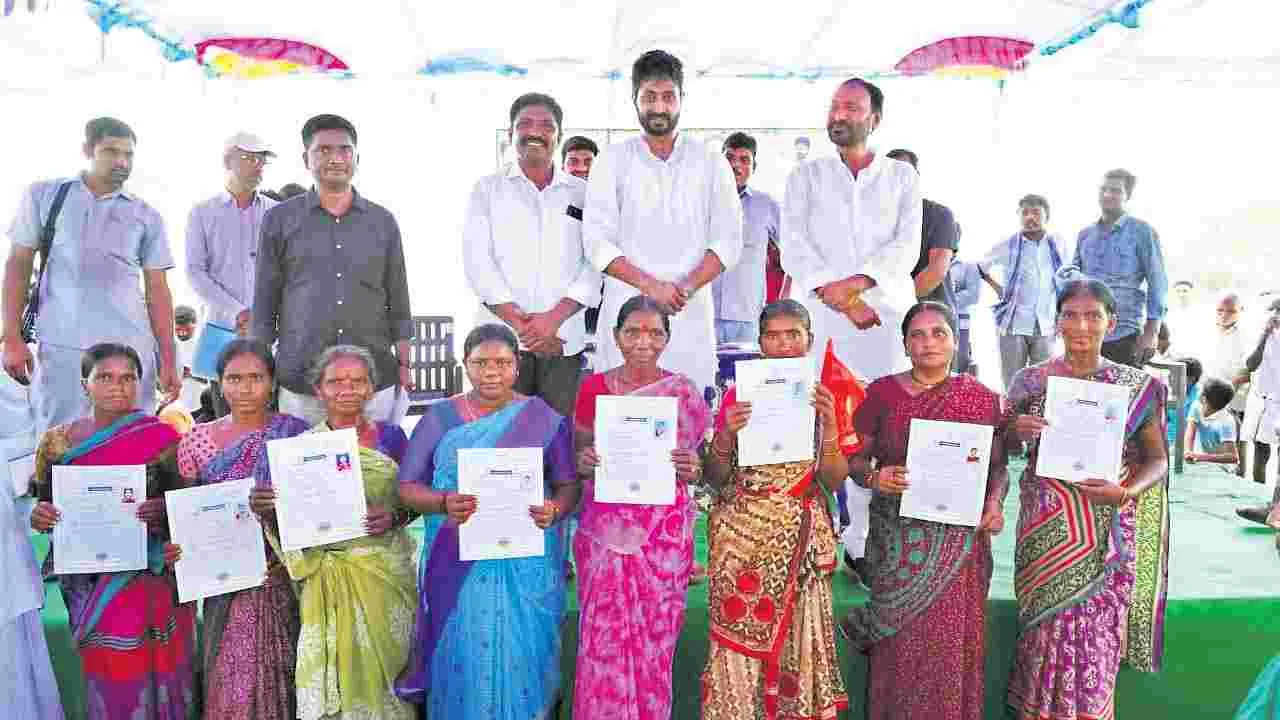తిరుమలగిరి(సాగర్), జూన 7 (ఆంధ్రజ్యోతి): పేద ప్రజల సంక్షేమమే లక్ష్యంగా ఈ ప్రాంత అభివృద్ధికి పాటుపడుతున్నట్లు ఎమ్మెల్యే కుందూరు జైవీర్రెడ్డి అన్నారు. మండలంలోని బోయగూడెం గ్రామంలో శనివారం 226 మంది పేదలకు ఎమ్మెల్సీ ఎంసీ.కోటిరెడ్డితో కలిసి ఇళ్ల స్థలాల పట్టాలు పంపిణీ చేశారు. ఈ సందర్భంగా ఎమ్మెల్యే మాట్లాడుతూ సుమారు 20 సంవత్సరాల క్రితం తన తండ్రి జానారెడ్డి పేదలకు ఇళ్ల స్థలాలు పంపిణీ చేసేందుకు కృషి చేశారని, అనివార్య కారణాల వల్ల ఆగిపోయాయని ప్రస్తుతం తన హయాంలో అందజేస్తున్నందుకు ఆనందంగా ఉందని అన్నారు. గ్రామాభివృద్ధికి తన సహకారం ఎల్లప్పుడూ ఉంటుందని అన్నారు. వాగు వెంట వ్యవసాయ మోటార్లకు ఉన్న విద్యుత సమస్య పరిష్కారానికి తనవంతుగా కృషి చేస్తానని హామీ ఇచ్చారు. అనంతరం ఎమ్మెల్సీ ఎంసీ.కోటిరెడ్డి మాట్లాడుతూ పేదలకు ఇళ్ల స్థలాల పట్టాలు పంపిణీ చేయడం సంతోషంగా ఉందని అన్నారు. ఇంకా ఎవరైనా అర్హులకు రానట్లయితే వారికి కూడా వచ్చే విధంగా తాను కృషి చేస్తానని అన్నారు. అంతకుముందు కాంగ్రెస్ పార్టీ కార్యకర్తలు, గ్రామస్థుల ఆధ్వర్యంలో గ్రామంలోని వీదుల గుండా ఊరేగింపు నిర్వహించారు. తహసీల్దార్ అధ్యక్షతన నిర్వహించిన కార్యక్రమంలో మార్కెట్ కమిటీ వైస్ చైర్మన కలసాని చంద్రశేఖర్, డీసీసీ ఆర్గనైజింగ్ సెక్రటరీ గడ్డం సాగర్రెడ్డి, నాయకులు అల్లి పెద్దిరాజు, యడవెల్లి వల్లభరెడ్డి, శాగం రాఘవరెడ్డి, రమావత కృష్ణానాయక్, గోదాల వెంకట్రెడ్డి, గడ్డం నవీనరెడ్డి, రామకృష్ణ, మెరావత మునినాయక్ తదితరులు పాల్గొన్నారు.