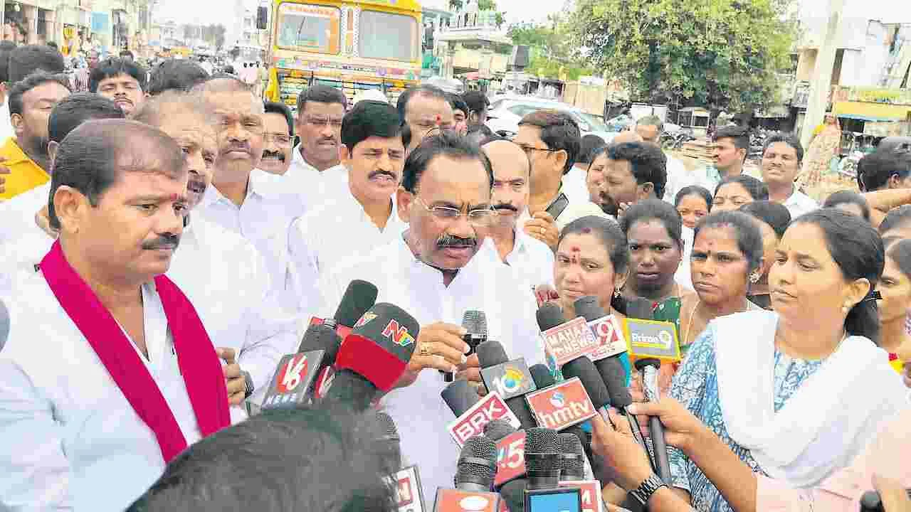 చండూరు, జూలై 2(ఆంధ్రజ్యోతి): బీఆర్ఎస్ పార్టీ నాయకులు, కార్యకర్తల జోలికి వస్తే సహించేది లేదని మాజీ ఎమ్మెల్యే కూసుకుం ట్ల ప్రభాకర్రెడ్డి హెచ్చరించారు. చండూరులో పట్టణంలో జరుగుతున్న రోడ్డు విస్తరణ పనులను బుధవారం ఆయన పరిశీలించారు. తమ పార్టీకి చెందిన మునిసిపల్ మాజీ చైర్మన తోకల చంద్రకళవెంకన్నకు చెందిన భవనాన్ని సమాచారం ఇవ్వకుండా కూల్చివేయడం ఎమ్మెల్యే రాజగోపాల్రెడ్డి పతనానికి నాంది అన్నారు. బీఆర్ఎస్ ప్ర భుత్వ హయాంలో తాను ఎమ్మెల్యేగా ఉన్నప్పుడు అప్పటి మంత్రి జగదీ్షరెడ్డి, కేటీఆర్ సహకారంతో చండూరు మునిసిపాలిటీ అభివృద్ధికి రూ.50కోట్లు నిధులు మంజూరు చేయించినట్లు తెలిపారు. కానీ ఇప్పటి వరకు ఉన్న నిధులను సద్వినియోగం చేసుకోకుండా ఎమ్మె ల్యే రాజగోపాల్రెడ్డి ఇష్టానుసారంగా వ్యవహరిస్తూ పరిపాలనను పక్కకుబెట్టి తుగ్లక్ అరాచకాలకు తెరలేపుతున్నాడని విమర్శించారు. రోడ్డు వెడల్పు పనులకు డీపీఆర్ లేకుండా ఒక దగ్గర 95 ఫీట్లు, మరో దగ్గర 90ఫీట్లు, వారి పార్టీ అనుచరుల గణానికి, ముడుపులు ముట్టిన చోట 85 ఫీట్లు అని ఇష్టానుసారంగా వ్యవహరిస్తూ వ్యవహరిస్తూ ప్రజలను అయోమయానికి గురి చేస్తున్నారని దు య్యబట్టారు. కాంగ్రెస్ పార్టీ అధికారంలోకి వచ్చి 18 నెలలు కావస్తున్నా తాము మంజూరు చేసిన నిధులే తప్ప, ఏ ఒక్క రూపాయి కూడా మునుగోడు నియోజకవర్గ అభివృద్ధి కోసం కేటాయించలేదని అన్నారు. రాజగోపాల్రెడ్డి గెలిచిన నాటి నుంచి నియోజకవర్గ అభివృద్ధికి ఎన్ని నిధులు తెచ్చారో చెప్పాలని ఆయన ప్రశ్నించారు. చండూరు మండల కేంద్రంలో చర్చకు సిద్ధమా అని ఆయన సవాల్ విసిరారు. కేసీఆర్ నాయకత్వంలో తాము ఎన్నో పోరాటాలు చేశామని, తెలంగాణ తె చ్చిన తాము ఇలాంటి దగాకోరు, దగుల్బాజీలకు భయపడేది లేదన్నారు. తమ పా ర్టీ కార్యకర్తల కోసం ఎంతటి త్యాగానికైనా, పోరాటానికైనా సిద్ధంగా ఉన్నట్లు పేర్కొ న్నారు. ఎప్పటికప్పుడు మీ అరాచకాలను, అకృత్యాలను ఎండగడుతూ ప్రజలకు వివరిస్తామన్నారు. కార్యక్రమంలో బీఆర్ఎస్ పార్టీ మండల, పట్టణ అధ్యక్షులు బొమ్మరబోయిన వెంకన్న, కొత్తపాలి సతీష్, చండూరు, చౌటుప్పల్ మాజీ జడ్పీటీసీలు కర్నాటి వెంకటేశం, పెద్దిటి బుచ్చిరెడ్డి, మునిసిపల్ మాజీ చైర్మన తోకల చం ద్రకళవెంకన్న, కౌన్సిలర్లు కోడి వెంకన్న, గుంటి వెంకటేశం, పెదగోని వెంకన్న, కురుపాటి సుదర్శన, తేలుకుంట్ల చంద్రశేఖర్, తేలుకుంట్ల జానయ్య పాల్గొన్నారు.