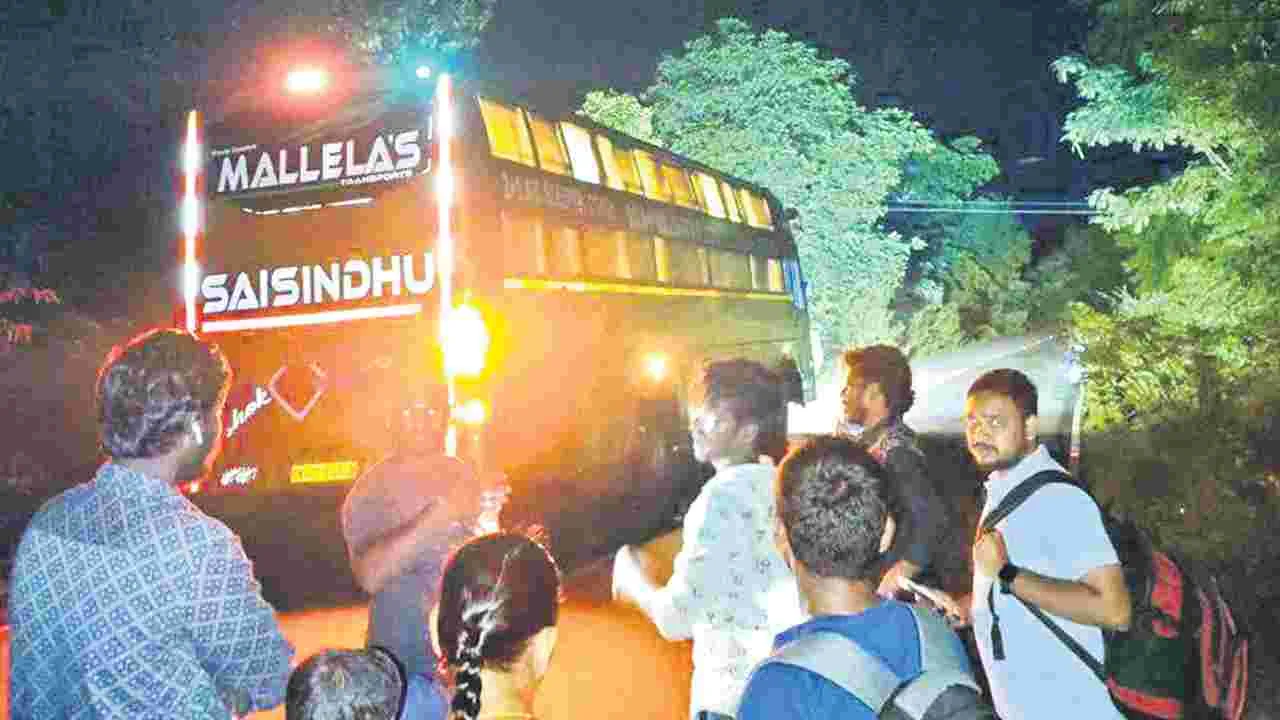 పొదలకూరు, మార్కాపురం, అక్టోబరు 26 (ఆంధ్రజ్యోతి): మూడు రోజుల క్రితం కర్నూలు జిల్లాలో జరిగిన ప్రైవేట్ ట్రావెల్ బస్సు ప్రమాద ఘటనను మరువక ముందే.. నెల్లూరు, ప్రకాశం జిల్లాలో మరో రెండు ప్రైవేట్ బస్సులు ప్రయాణికులను హడలెత్తించాయి. నెల్లూరు జిల్లా పొదలకూరు నుంచి శనివారం రాత్రి 11 గంటలకు 15 మంది ప్రయాణికులతో బెంగళూరుకు ప్రైవేటు ట్రావెల్ బస్సు బయలుదేరింది. అక్కడి నుంచి 3కి.మీ. దూరాన ఉన్న మర్రిపల్లిగ్రామం వద్దకు రాగానే బస్సులో నుంచి పొగలు, మాడిన వాసన వచ్చింది. ప్రయాణికులు భయంతో కేకలు వేశారు. డ్రైవర్ బస్సును నిలిపివేయడంతో వెంటనే వారు తమ లగేజీలతో సహా కిందకు దిగి పరుగులు తీశారు. బ్యాటరీ వైర్ల షార్ట్సర్క్యూట్ వల్ల పొగలు వచ్చినట్లు డ్రైవర్ తెలిపారు. మరో బస్సును ఏర్పాటు చేసినా, ఆలస్యం కారణంగానూ, భయంతోనూ ప్రయాణికులు ఎవరూ ఎక్కలేదు. మరో ఘటనలో.. మార్కాపురం నుంచి రాయల్ వొయేజ్ (ఆర్వీటీ) ట్రావెల్ బస్సు ఏడుగురు ప్రయాణికులతో బెంగళూరుకు బయల్దేరింది. వేములకోట గ్రామం దాటిన తర్వాత కోమటికుంటకు సమీపంలో ఎదురుగా వస్తున్న ఆర్టీసీ బస్సును తప్పించబోయి డ్రైవర్ హఠాత్తుగా బ్రేక్ వేశారు. దీంతో బస్సు అదుపు తప్పి రోడ్డు మార్జిన్ దాటి ముందుభాగం పొలంలోకి వెళ్లింది. బస్సు బోల్తాపడకపోవడంతో పెను ప్రమాదం తప్పింది. ప్రయాణికులు బెంబేలెత్తిపోయారు. లగేజీతో సహా దిగిపోయారు.
