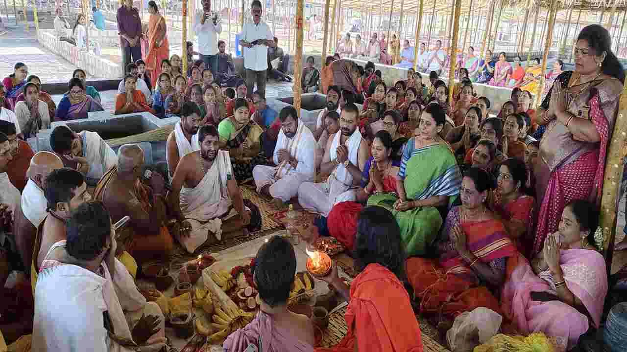 నస్పూర్, ఫిబ్రవరి 15 (ఆంధ్రజ్యోతి) : లోక కళ్యాణం కొరకు తలపెట్టిన శ్రీ వైష్ణవ అయుత చండీ అతిరుద్రం శ్రీ కృష్ణ జ్యోతి స్వరూపానంద స్వామీజీ నేతృత్వంలో నస్పూర్లో విశ్వశాంతి మహాయాగ మహోత్సవం శనివారం ప్రారంభమైంది. 86వ విశ్వశాంతి మహాయాగ మహోత్సవంలో భాగంగా తొలిరోజు మహా గణపతి పూజ కార్యక్రమాలు శాస్ర్తోక్తంగా నిర్వహించారు. గణపతి పూజ, శుద్దిపుణ్యాహవాచనం, పంచగవ్యప్రాశన, బుత్విక్వరుణ , గో సహిత యాగశాల ప్రవేశం, ఆఖండ జ్యోతి, స్థాపన, యాగశాల సంస్కారాలు, మాతృకాపూజ, మంటపారాధనలు, వాస్తు హోమం, ప్రధాన మంటపారాధనలు, ప్రధాన కలశ స్థాపన, అగ్ని మథన, ధ్వజారోహణం కార్యక్రమాలు జరిగాయి. జిల్లా కాంగ్రెస్ పార్టీ అధ్యక్షురాలు కొక్కిరాల సురేఖ ప్రేమ్ సాగర్ రావు పూజల్లో పాల్గొన్నారు. పట్టణంలో 16 రోజుల పాటు మార్చి 2వ తేది వరకు యాగ కార్యక్రమాలు జరుగనుండడంతో నస్పూర్ పట్టణం ఆధ్యాత్మిక వాతావరణం సంతరించుకుంది. ఆదివారం ఉదయం గణపతి, లక్ష్మి గణపతి, సూర్య హోమాలు, సాయంత్రం గణపతికి లక్ష గరికార్చన, శ్రీ సిద్ది బుద్ది సమేత వరసిద్ది వినాయక కళ్యాణ మహోత్సవం జరుగనుంది.