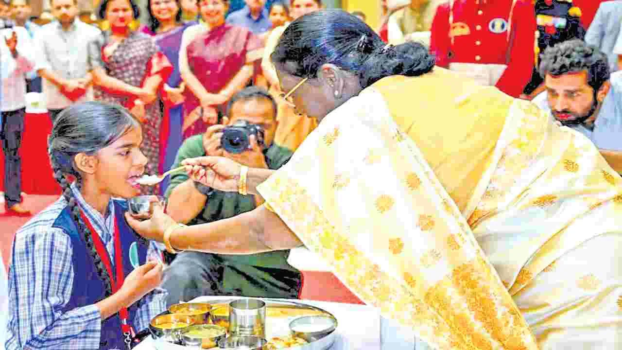 మంగళగిరి సిటీ, మార్చి 17(ఆంధ్రజ్యోతి): అక్షయపాత్ర ఫౌండేషన్ గొప్ప మైలురాయిని చేరుకుంది. పాతికేళ్ల ప్రస్థానంలో దేశవ్యాప్తంగా పాఠశాలల విద్యార్థులకు 500 కోట్ల భోజనాలు అందించి చరిత్రలో నిలిచిపోయే ఘనత సాధించింది. కేంద్ర ప్రభుత్వం నిర్వహిస్తున్న పీఎం పోషణ్ (మధ్యాహ్న భోజనం) పథకంలో భాగంగా మంగళవారం ఢిల్లీలోని రాష్ట్రపతి భవన్ సాంస్కృతిక కేంద్రంలో ప్రత్యేక కార్యక్రమం నిర్వహించారు. ఈ కార్యక్రమానికి రాష్ట్రపతి ద్రౌపది ముర్ము, కేంద్ర మంత్రి ధర్మేంద్ర ప్రధాన్ ముఖ్యఅతిథులుగా హాజరయ్యారు. ఈ సందర్భంగా అక్షయపాత్ర సేవలను వారు ప్రశంసించారు. రాష్ట్రపతి ముర్ము విద్యార్థులకు స్వయంగా భోజనం తినిపించి, బహుమతులను అందజేశారు. ఈ కార్యక్రమంలో అక్షయపాత్ర ఫౌండేషన్ తరఫున సంస్థ చైర్మన్ మధు పండిత్ దాస, వైస్ చైర్మన్ చంచలపతి దాస, ఏపీ సెంట్రల్ రీజినల్ ప్రెసిడెంట్ వంశీధర దాస పాల్గొన్నారు. 2024, ఏప్రిల్ 2న న్యూయార్క్లోని ఐక్యరాజ్య సమితి ప్రధాన కార్యాలయంలో 400 కోట్ల భోజనాలు మైలురాయి కార్యక్రమం వేడుకగా జరిగిందని, ఇప్పుడు 500 కోట్ల భోజనాల వేడుక ఢిల్లీలో రాష్ట్రపతి సమక్షంలో జరగడం సంతోషంగా ఉందని హర్షం వ్యక్తం చేశారు.