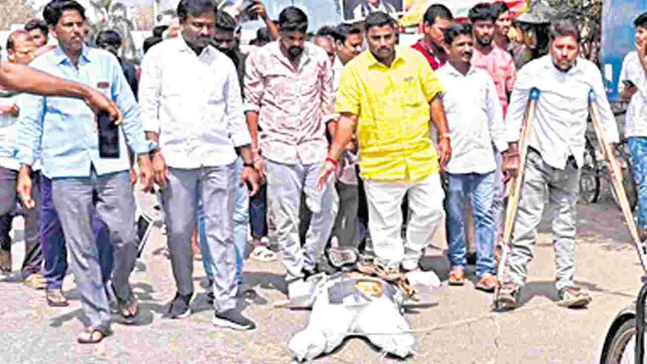 అనంతపురం క్రైం, ఫిబ్రవరి 1(ఆంధ్రజ్యోతి): ముఖ్యమంత్రిపై అనుచిత వ్యాఖ్యలు చేసిన వైసీపీ నేత అంబటి రాంబాబు దిష్టి బొమ్మకు టీడీపీ నాయకులు అనంతపురంలో ఆదివారం అంతిమయాత్ర నిర్వహించారు. క్లాక్ టవర్ నుంచీ సప్తగిరి సర్కిల్ వరకూ అంబటి దిష్టిబొమ్మను మోస్తూ శవయాత్ర చేశారు. తర్వాత సప్తగిరి సర్కిల్లో ఆయన దిష్టిబొమ్మను పెట్రోల్ పోసి, నిప్పు పెట్టి దహనం చేశారు. దివ్యాంగులు, వికలాంగుల కార్పొరేషన్ చైర్మన్ గుడిపూటి నారాయణస్వామి ఆధ్వర్యంలో దివ్యాంగులు.. అంబటి దిష్టిబొమ్మను ఈడ్చుకుంటూ ర్యాలీగా వెళ్లి క్లాక్టవర్ వద్ద దహనం చేశారు.