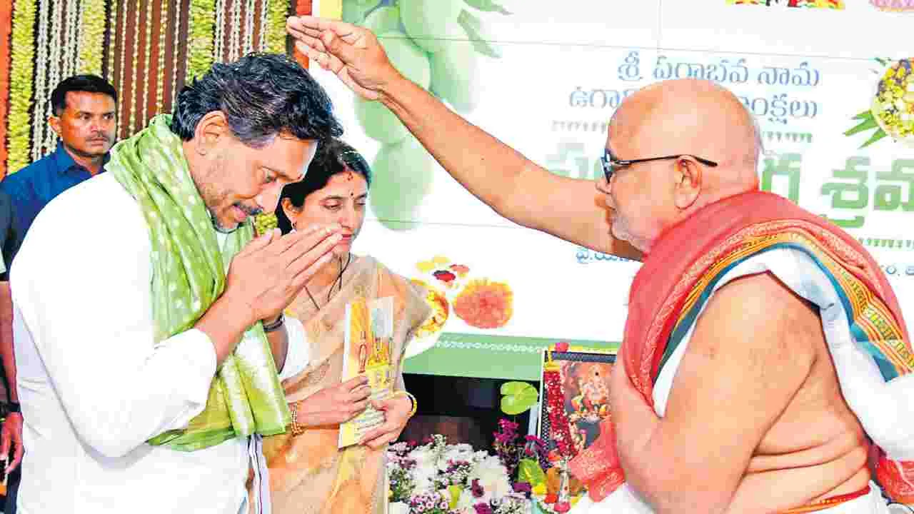 అమరావతి, మార్చి 19 (ఆంధ్రజ్యోతి): ఈ ఏడాది వైసీపీ అధ్యక్షుడు వైఎస్ జగన్మోహన్రెడ్డి జాతకం బలహీనంగా ఉందని పంచాంగకర్త పిడపర్తి సుబ్రహ్మణ్యశాస్ర్తి ఆయన సమక్షంలోనే వెల్లడించారు. రాష్ట్రంలో రాజులు నీతిమంతంగా పరిపాలన చేస్తారని తెలిపారు. ఉగాదిని పురస్కరించుకుని గురువారం తాడేపల్లి ప్యాలె్సలో శ్రీ పరాభవనామ సంవత్సర పంచాంగ శ్రవణం జరిగింది. జగన్ దంపతులు హాజరయ్యారు. పంచాంగకర్త పిడపర్తి రాశి ఫలాలను చదివారు. జగన్ నక్షత్రం ఆరుద్ర.. మిథున రాశి అని.. ఈ రాశి వారికి ఈ ఏడాది సామాన్య ఫలితాలే ఉంటాయని.. వచ్చే సంవత్సరం కొంత మెరుగవుతాయని.. ఆ పై ఏడాది ఇంకొద్దిగా మెరుగవుతాయని చెప్పారు. ఆయన జాతకం బలహీనంగా ఉన్నా.. ఆయన భార్య భారతి జాతకం (రోహిణి నక్షత్రం-మృగశిర రాశి) బలంగా ఉందని.. ఆ ప్రభావంతో జగన్ అనుకున్నవి జరిగే అవకాశముందని తెలిపారు. ‘రాష్ట్రంలో వైరస్వభావం లేకుండా రాజులు పాలన చేస్తారు.. భూమి ధరవరలతో నిండి ఉంటుంది. గురుడు రాజ్యాధిపతి కావడంతో ప్రజలు ఈ ఏడాదంతా ధర్మకార్యాలపై ఆసక్తి కలిగి ఉంటారు. రాజులంతా నీతిమంతులై పరిపాలన చేస్తారు.. ప్రజలంతా ఆరోగ్యంగా, సుఖంగా, సుభిక్షంగా ఉంటారు’ అని వివరించారు. పంటలు పుష్కలంగా పండుతాయని.. చిరుఽధాన్యాల దిగుబడి గణనీయంగా పెరుగుతుందని తెలిపారు. ప్రభుత్వం స్థిరంగా ఉంటుందన్నారు. చివరిలో పండితుల నుంచి జగన్ దంపతులు ఉగాది పచ్చడి స్వీకరించారు. పంచాంగ శ్రవణానికి ముందే.. జగన్ రాశిఫలాలను సజ్జల రామకృష్ణారెడ్డికి చెప్పానని పిడపర్తి వెల్లడించారు. అయితే కొందరునేతలు తమ అధినేత రాశిఫలాలు వెల్లడించాలని కోరారు. ఆయన జాతకం సాధారణంగా ఉందని పిడపర్తి చెప్పడంతో వారు దిగాలుపడ్డారు. అలాగే పంచాంగ శ్రవణం జరుగుతున్నంత సేపూ జగన్ సీరియ్సగా కనిపించారు. ప్రదక్షిణ చేయాలని పండితులు సూచించినా పాటించలేదు.