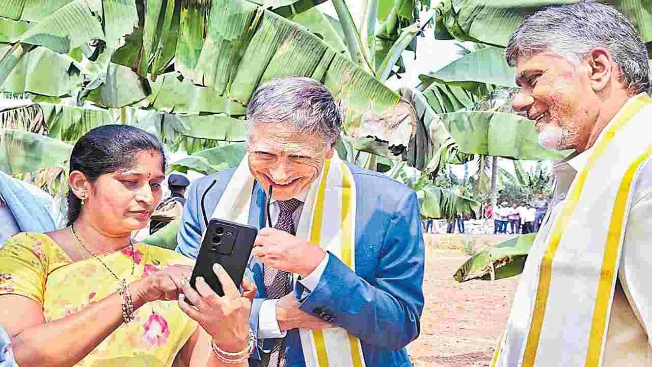అమరావతి, ఫిబ్రవరి 16 (ఆంధ్రజ్యోతి): ఏపీ ప్రభుత్వం రైతులకు అందిస్తున్న ఏఐ-అగ్రిటెక్ సేవలు అత్యద్భుతమని గేట్స్ ఫౌండేషన్ చైర్మన్ బిల్ గేట్స్ ప్రశంసించారు. వ్యవసాయ రంగంలో రాష్ట్ర ప్రభుత్వం అమలు చేస్తున్న సాంకేతికతను, ఏఐ ఆధారిత రైతు సేవలను సోమవారం సీఎం చంద్రబాబుతో కలిసి బిల్ గేట్స్ స్వయంగా పరిశీలించారు. ఉండవల్లి కరకట్ట సమీపంలోని వ్యవసాయ క్షేత్రాన్ని గేట్స్ బృందం సందర్శించింది. ఈ సందర్భంగా రైతులు వినియోగిస్తున్న సాంకేతికత గురించి వ్యవసాయ శాఖ ఉన్నతాధికారులు గేట్స్కు వివరించారు. వ్యవసాయం-అనుబంధ రంగాల్లో దిగుబడి పెంపు, సాగు ఖర్చు తగ్గింపుపై ప్రభుత్వం తీసుకున్న చర్యలను తెలిపారు. నాణ్యమైన పంట ఉత్పత్తుల ఎగుమతులకు ప్రత్యేక కార్యాచరణ చేపట్టి రైతులకు అధిక ఆదాయం వచ్చేలా ప్రయత్నిస్తున్నట్లు చెప్పారు. రైతులకు మెరుగైన సేవలు అందించేందుకు రైతు సేవా కేంద్రాల్లో అనలిటిక్స్, మానిటరింగ్ డ్యాష్ బోర్డులు వినియోగిస్తున్నామని వెల్లడించారు. ఈ సందర్భంగా మహిళా రైతులు మణి, అన్నపూర్ణ ఏపీ అగ్రికల్చర్ ఇన్ఫర్మేషన్ మేనేజ్మెంట్ సిస్టమ్ (ఏపీ-ఏఐఎంఎస్) యాప్ గురించి గేట్స్కు వివరించారు. ఇటీవలే ముఖ్యమంత్రి ప్రారంభించిన ఈ యాప్ ద్వారా ఏ పంటలు పండించాలి? సాగునీటి నిర్వహణ, నేల స్వభావం, ధరలు, మార్కెట్ సమాచారం, పురుగు మందుల నియంత్రణ వంటి విషయాలు సులభంగా తెలుసుకుంటున్నామని చెప్పారు.