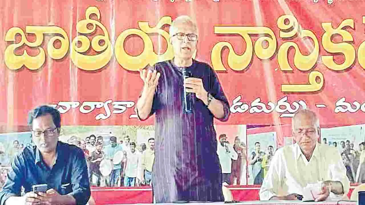 మంగళగిరి సిటీ, ఫిబ్రవరి 14(ఆంధ్రజ్యోతి): చార్వాక సిద్ధాంతం ప్రజల్లోకి బలంగా వెళుతూ భావితరాలకు చేరుకుంటుందని మాజీ ఎమ్మెల్సీ ఎంవీఎస్ శర్మ అన్నారు. గుంటూరు జిల్లా మంగళగిరి మండలం నిడమర్రు గ్రామంలోని చార్వాక ఆశ్రమంలో నాస్తిక సమాజం, ఆంధ్రప్రదేశ్-తెలంగాణ ఆధ్వర్యంలో రెండ్రోజులపాటు జరుగనున్న 34వ నాస్తిక మేళా శనివారం ఉదయం ప్రారంభమైంది. ‘ప్రాచీన భారతంలో చార్వాకం’ అనే అంశంపై ఎంవీఎస్ శర్మ మాట్లాడారు. ‘వేదాలు నేర్చుకోవడం అంటే బట్టీపట్టడం మాత్రమే. అందులో ఎలాంటి జ్ఞానం లేదు. ఇదే విషయాన్ని చార్వాకులు ముందు నుంచీ చెబుతున్నప్పటికీ మతవాదులు భౌతిక దాడులు చేస్తున్నారు. ఆది భౌతికవాదులు, చార్వాకులు... ఆత్మ, పరమాత్మ, పునర్జన్మ, దేవుడు, మూఢనమ్మకాలను తిరస్కరించారు’ అని శర్మ గుర్తు చేశారు. ‘వైజ్ఞానికతకు, మత భావాలకు పొసగని మైత్రి’ అనే అంశంపై డాక్టర్ జయకుమార్, ‘పురాణ ప్రలాపం’ అనే అంశంపై జే లక్ష్మీరెడ్డి, ‘దాచేస్తే దాగని సత్యం-జీవ పరిణామం’ అనే అంశంపై కట్టా సత్యప్రసాద్, ‘శాస్త్రీయ దృక్పథ ప్రచారంలో అవలంభించాల్సిన విధానాలు’ అనే అంశంపై డాక్టర్ సీహెచ్ రవికుమార్, డాక్టర్ శరత్ ప్రసంగించారు. ‘మనిషితనం తప్ప ఏమీ తెలియని వట్టి చేతుల మనిషి చార్వాక రామకృష్ణ’ పుస్తకాన్ని డాక్టర్ భానుప్రసాద్, డాక్టర్ చల్లపల్లి స్వరూపరాణి, సీహెచ్ శివారెడ్డి, చార్వాక ఎస్ఎ్సఎఫ్ ఆవిష్కరించారు.