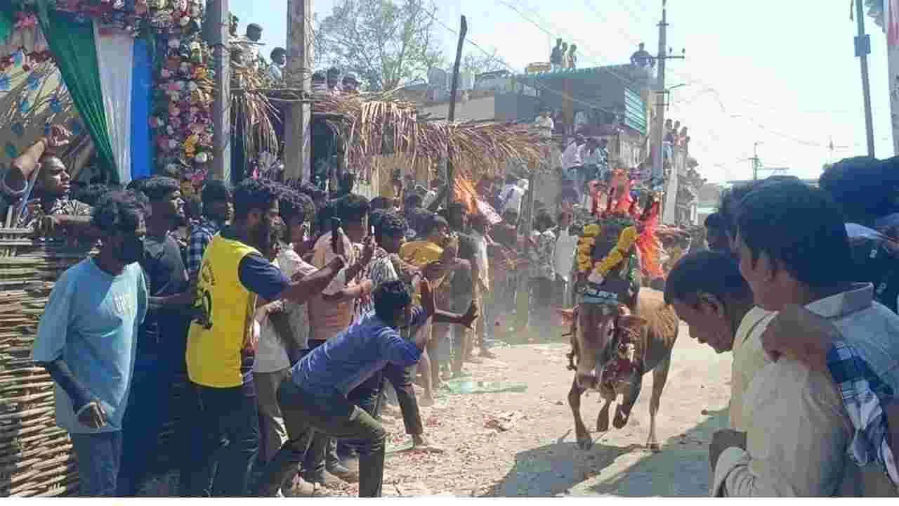 చంద్రగిరి, జనవరి 17(ఆంద్రజ్యోతి): పశువుల పండగను పురస్కరించుకుని మండలంలోని మల్లయ్యపల్లె, దోర్నకంబాల, మండపంపల్లె గ్రామాలలో శనివారం జల్లికట్టు నిర్వహించారు. స్థానికులతోపాటు చుట్టుపక్కల గ్రామస్తులు తరలిరావడంతో ఆయా గ్రామాల్లో తిరునాళ్ల వాతావరణం కనిపించింది. ఆవులు, కోడెగిత్తల కొమ్ములకు రంగులు పూసి, అలంకరించారు. చెక్కపలకలు కట్టారు. డప్పులు వాయించి, అల్లివైపు తరిమారు. కోడెగిత్తలను నిలువరించి పలకలను సొంతం చేసుకునేందుకు యువకులు పోటీపడ్డారు. ఈ క్రమంలో కొందరికి గాయాలయ్యాయి. చివరిగా పలకలను దక్కించుకున్న యువకులు విజయగర్వంతో పొంగిపోయారు. చంద్రగిరి సీఐ సురే్షకుమార్ ఆధ్వర్యంలో బందోబస్తు ఏర్పాటు చేశారు. కాగా, అనుప్పల్లి-చంద్రగిరి మార్గంలో వాహనాల రద్దీ పెరగడంతో ట్రాఫిక్ సమస్య తలెత్తింది.