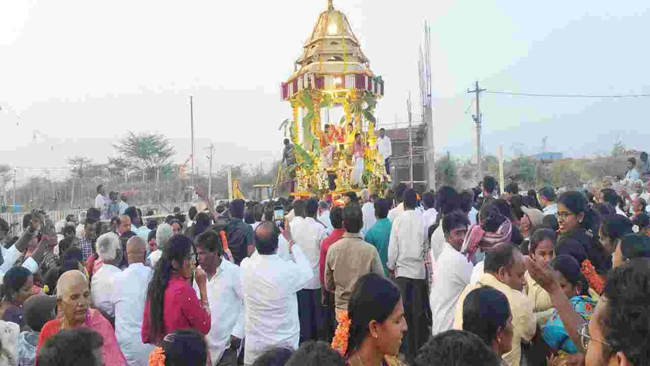 కలకడ, ఫిబ్రవరి 17(ఆంధ్రజ్యోతి): కామాక్షి సమేత సిద్దేశ్వరుడి రథోత్సవం అద్యంతం వేడుకగా సాగింది. సత్యవతి నదీ తీరాన జరుగుతున్న బ్రహ్మోత్సవాల్లో భాగంగా మంగళవారం స్వామి, అమ్మవార్లను రథంపై ఆశీనులను చేశారు. రథాన్ని భక్తులు ఆలయం చుట్టూ లాగారు. ఆలయం వద్ద అర్చకులు విజయసారథి, సుబ్రహ్మణ్యం, మహేశ్, సునీల్ మహానివేదన శాస్త్రోక్తంగా నిర్వహించారు. ఇందులో భాగంగా ఆలయం ఎదుట ప్రసాదం తయారు చేసి భక్తులకు పంపిణీ చేశారు. ఆలయంలో మూలవిరాట్టుకు త్రినేత్రధారణ చేసి ప్రత్యేక పూజలను చేశారు. తిరునాళ్లకు వచ్చిన వేలాది భక్తులు స్వామి, అమ్మవార్లను దర్శించుకుని ప్రత్యేక పూజలు, అభిషేకాల్లో పాల్గొన్నారు. ఆలయం సహా పరిసరాలు, తిరునాళ్ల జరిగే ప్రదేశాలు భక్తులతో కిక్కిరిసాయి. ఆలయ కమిటీ ఆధ్వర్యంలో స్వామి, అమ్మవార్ల ఉత్సవమూర్తులను రథంపై ఆశీనులను చేసి ఆలయం చుట్టూ భక్తులు రథాన్ని కలకడ వీధుల్లో లాగారు. దాతలు భక్తులకు ప్రసాదాలను పంపిణీ చేశారు. మంగళవాయిద్యాలు, పిల్లన్నగ్రోవిలు, బాణాసంచా పేల్చుతూ ఊరేగింపు జరిగింది. కార్యక్రమంలో ధర్మకర్త త్రికూటం రవీంద్రశర్మ, ఆలయ కమిటీ సభ్యులు మద్దిపట్ల వెంకటరమణ నాయుడు, కోనేని రెడ్డెప్పనాయుడు, వేలాది ప్రజలు పాల్గొన్నారు.