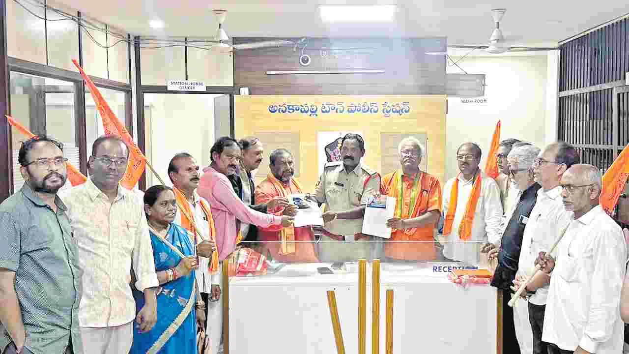 విశాఖపట్నం, ఏప్రిల్ 25(ఆంధ్రజ్యోతి): హిందువుల ఆరాధ్య దైవం శ్రీరాముడిపై అనుచిత వ్యాఖ్యలు చేసిన సినీ నటుడు ప్రకాశ్రాజ్పై చర్యలు తీసుకోవాలని ఆర్ఎస్ఎస్, బీజేపీ జిల్లా నేతలు కోరారు. ఈమేరకు శనివారం అనకాపల్లి పట్టణ పోలీసులకు ఫిర్యాదు చేశారు. ‘హిందువుల మనోభావాలు దెబ్బతీసేలా ప్రకాశ్రాజ్ మాట్లాడారు. దేశంలో మత కల్లోలాలు సృష్టించడానికి విదేశీ శక్తులతో ఆయన చేయి కలిపారు. ఇలాంటి దుష్టులను చట్టపరంగా, బహిరంగంగా శిక్షించాలి’ అని డిమాండ్ చేశారు.