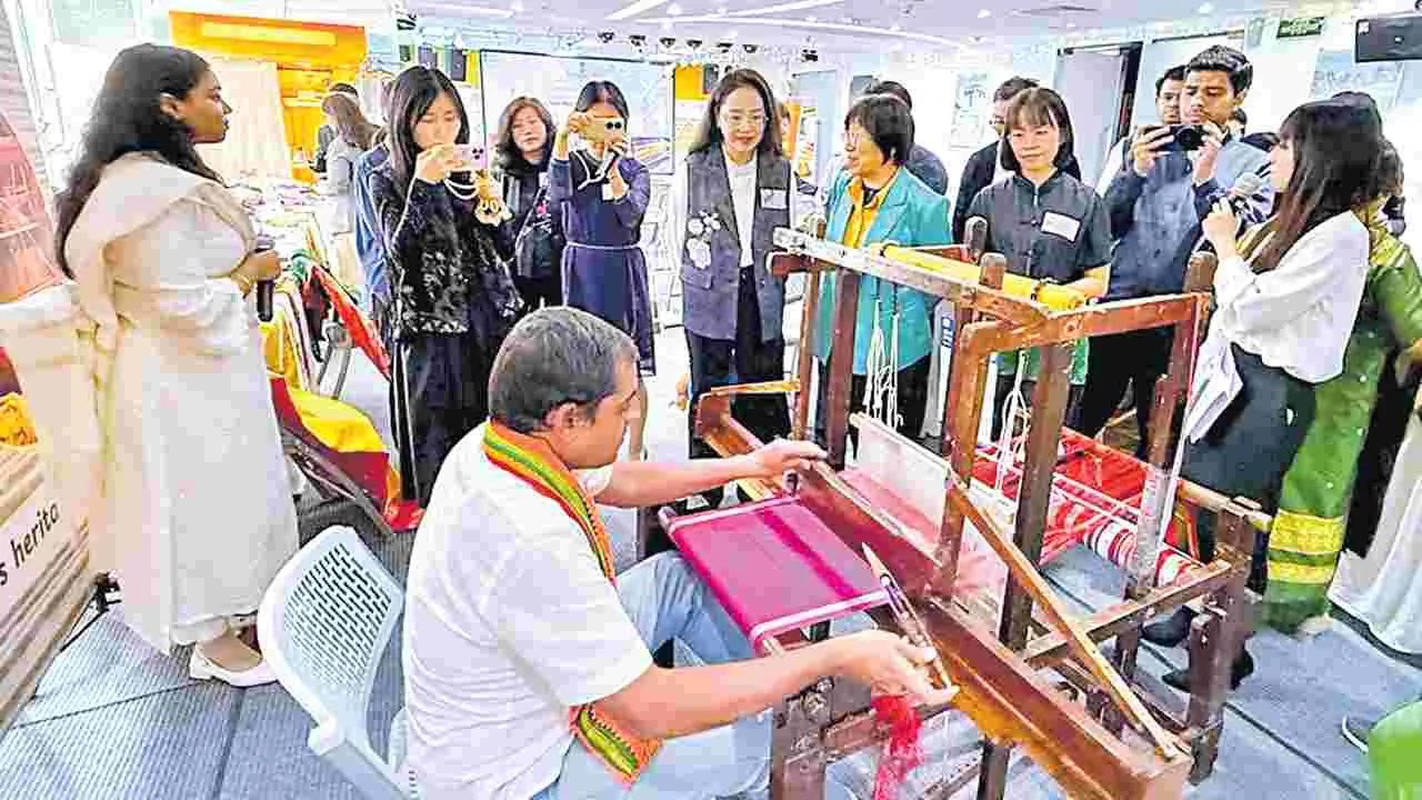 భారత్లో తయారయ్యే చేనేత పట్టు చీరలు నాణ్యతకు, కళాత్మకతకు చిహ్నంగా నిలుస్తాయి. ప్రపంచ ప్రఖ్యాతిగాంచిన ఈ పట్టు చీరల తయారీని చైనాలో ప్రదర్శించారు.