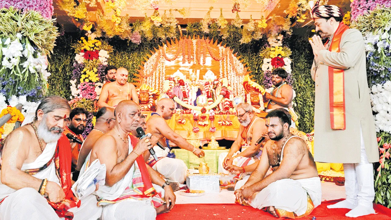 రాత్రి11.30గంటలకు ఎదురు సన్నా హంతో కల్యాణతంతు ప్రారంభమైంది. అనాదిగా వస్తున్న సంప్రదాయం ప్రకా రం పశ్చిమగోదావరిజిల్లా మొగల్తూరుకు చెందిన ఆలయ ఫౌండర్ ఫ్యామిలీ మెంబర్, చై ర్మన్ రాజాకలిదిండి కుమారరామా గోపాలరాజా బహుద్దూర్ శ్రీవారి తరపున, అర్చకులు అమ్మ వారి తరపున వివాహకర్తలుగా వ్యవహరించా రు. ఆలయంనుంచి తొలుత స్వామిని, తర్వాత అమ్మవార్లను వేదపండితుల మంత్రోచ్ఛారణల మధ్య అర్చకులు, అధికారులు పల్లకిలో వేర్వేరు గా కల్యాణ మండపానికి తీసుకొచ్చారు. అంత ర్వేదికి చెందిన డాక్టర్ పోతురాజు సూర్యవెంక టసత్యనారాయణ కుటుంబీకులు గతంలో ఇచ్చి న ఆభరణాలను అలంకరించారు. పేరూరు వేదపండితులు స్వామిని దర్శించుకున్నారు. స్వామి తలంబ్రాలను పశ్చిమగోదావరి జిల్లాకు చెందిన పొలమూరి కుటుంబీకులు తీసుకొచ్చారు.