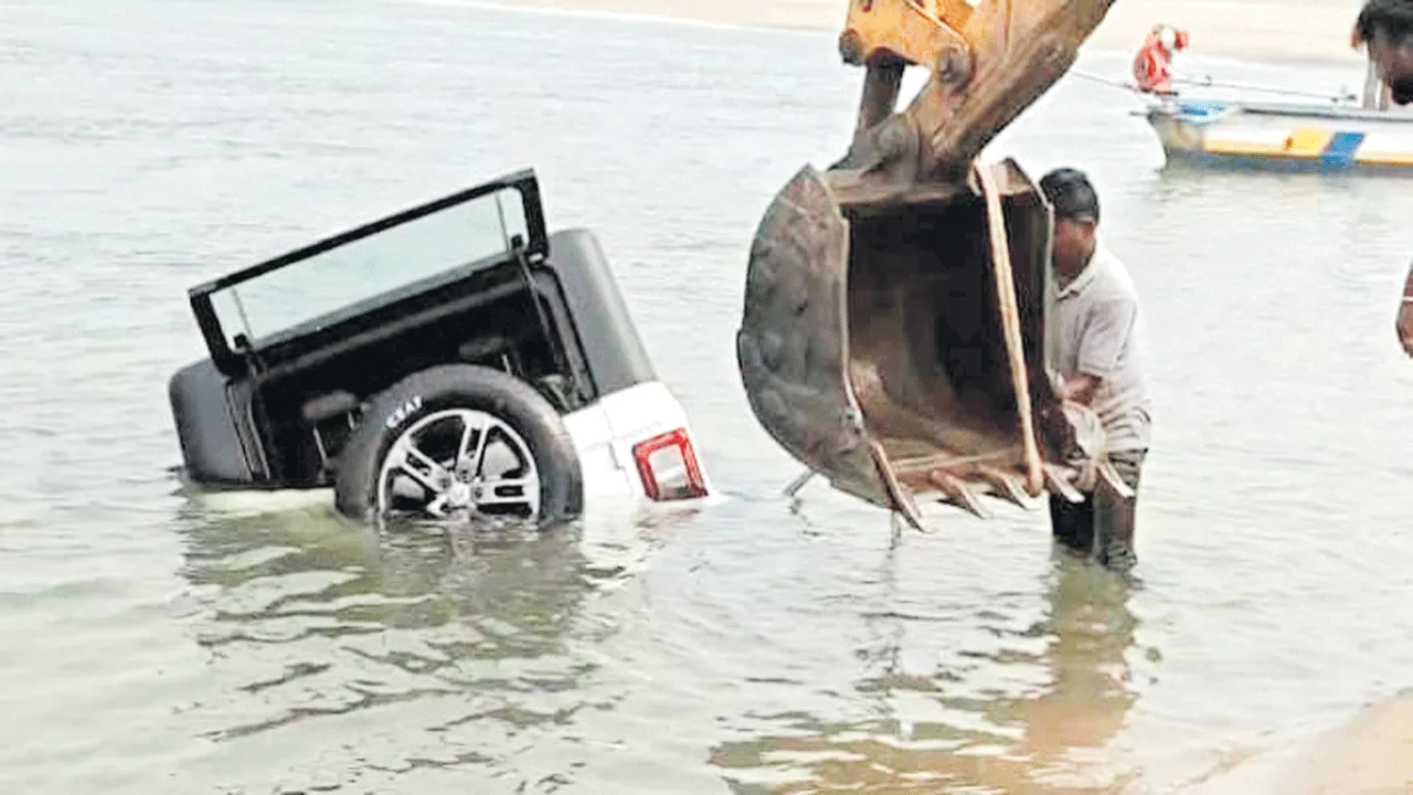 అంతర్వేది బీచ్కు థార్ జీప్లో సరదాగా వచ్చిన ముగ్గురు యువకులు