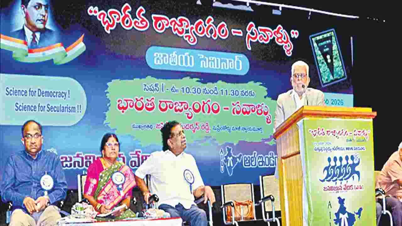 విజయవాడ, జనవరి 25(ఆంధ్రజ్యోతి): రాజ్యాంగ వ్యవస్థలో భాగంగా ఉన్న గవర్నర్లే ఇప్పుడు శాసనసభల్లో ప్రతిపక్ష పాత్ర పోషిస్తున్నారని సుప్రీంకోర్టు మాజీ న్యాయమూర్తి జస్టిస్ సుదర్శన్రెడ్డి ఆక్షేపించారు. సాధారణంగా గవర్నర్లు ప్రసంగాలు చేసేటప్పుడు ప్రతిపక్షాలు వాకౌట్, నిరసన తెలపడం చేస్తాయని.. నేడు వాటిని గవర్నర్లే చేసి చూపిస్తున్నారని విమర్శించారు. జనవిజ్ఞాన వేదిక(జేవీవీ), ఆలిండియా లాయర్స్ యూనియన్(ఐలూ) ఆధ్వర్వంలో విజయవాడ మాకినేని బసవపున్నయ్య విజ్ఞాన కేంద్రంలో ఆదివారం ‘భారత రాజ్యాంగం-సవాళ్లు’ అనే అంశంపై జరిగిన జాతీయ సదస్సులో ఆయన పాల్గొన్నారు. తొలుత అంబేడ్కర్ చిత్రపటానికి పూలమాలలు వేసి నివాళులర్పించారు. అనంతరం జేవీవీ ప్రచురించిన ‘భారత రాజ్యాంగం-ముఖ్యాంశాలు’ పుస్తకాన్ని ఆయన, ‘రాజ్యాంగ నిర్మాణం-పీఠిక’ పుస్తకాన్ని జేవీవీ వ్యవస్థాపకుడు బాలసుబ్రహ్మణ్యం ఆవిష్కరించారు. అనంతరం సుదర్శన్రెడ్డి ప్రసంగించారు. రాజ్యాంగాన్ని కాపాడాల్సిన వ్యవస్థలే దానికి రకరకాల సవాళ్లు విసురుతున్నాయన్నాయని, వీటిలో న్యాయ వ్యవస్థ కూడా ఉందన్నారు. ‘ఇటీవల తమిళనాడు అసెంబ్లీలో గవర్నర్ ఏమీ చదవకుండా వాకౌట్ చేశారు. కర్ణాటక గవర్నర్ ప్రసంగంలోని మొదటి వాక్యం, చివరి వాక్యం చదివి వెళ్లిపోయారు. కేరళ గవర్నర్ ఏకంగా తాను రాసుకున్నదే చదువుతానని చెప్పారు. రాజ్యాంగాన్ని పది రెట్లు పెంచినా, తగ్గించినా.. పాలనా విధానాల ద్వారానే దాని మౌలిక స్వరూపం పూర్తిగా ధ్వంసమవుతుందని అంబేడ్కర్ ఆనాడే చెప్పారు. ఇప్పుడదే జరుగుతోంది’ అని తెలిపారు. తమిళనాడులోని మదురైలో దీపం వివాదాన్నీ ప్రస్తావించారు. పార్లమెంటు సమావేశాల్లో కేంద్రం ఏ బిల్లు ప్రవేశపెడుతుందో చివరి క్షణం వరకు ఎంపీలకు తెలియడం లేదన్నారు. ఎజెండాలో లేని అంశాలను స్పీకర్ అనుమతితో సప్లిమెంటరీ అంశంగా ప్రవేశపెడుతున్నారని..