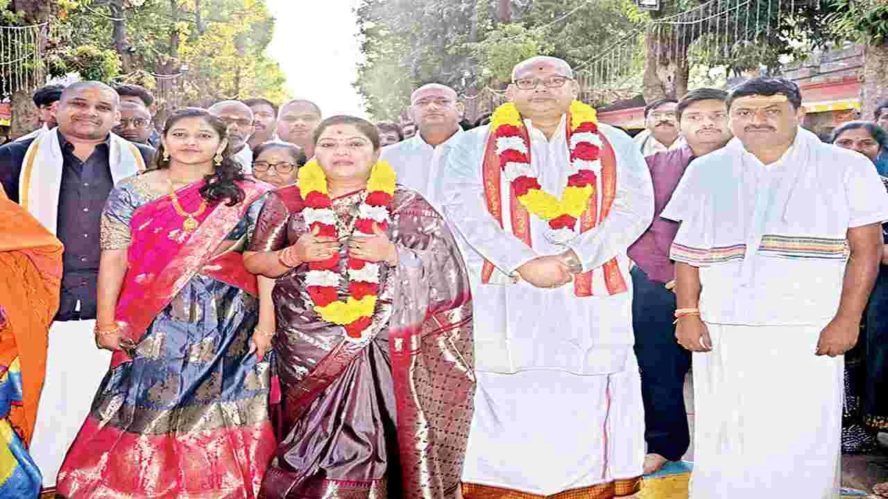 శ్రీశైలం ఫిబ్రవరి 22 (ఆంధ్రజ్యోతి): నంద్యాల జిల్లా శ్రీశైల భ్రమరాంబ మల్లికార్జున స్వామి, అమ్మవార్లను గిరిజనశాఖ మంత్రి గుమ్మడి సంధ్యారాణి దర్శించుకున్నారు. ఆదివారం తెల్లవారుజామున ఆలయ ప్రధాన గోపురం వద్దకు కుటుంబ సభ్యులతో చేరుకున్న వారికి అర్చక వేదపండితులు తిలకధారణ చేయగా ఏఈవో వెంకటేశ్వరరావు ఆలయ మర్యాదలతో స్వాగతం పలికారు. మంత్రి, కుటుంబ సభ్యులు.. మల్లికార్జునస్వామికి పంచామృతాభిషేకం, విశేష పూజలు చేశారు. అమ్మవారికి కుంకుమార్చన చేసుకుని మంగళ హారతులు సమర్పించారు. ప్రాకారంలోని పరివార ఆలయాలను దర్శించుకుని విశేషార్చనలు నిర్వహించారు. అనంతరం అమ్మవారి ప్రాకార మండపంలో వేదపండితులు వేదాశీర్వచనాలు వల్లించి తీర్థప్రసాదాలతో పాటు పరిమళ విభూది, శేషవస్త్రాలు, జ్ఞాపికను అందజేశారు. క్షేత్ర విశేషాలను పొందుపరిచిన శ్రీశైలం కాఫీ టేబుల్ బుక్ను వారికి అందజేశారు.