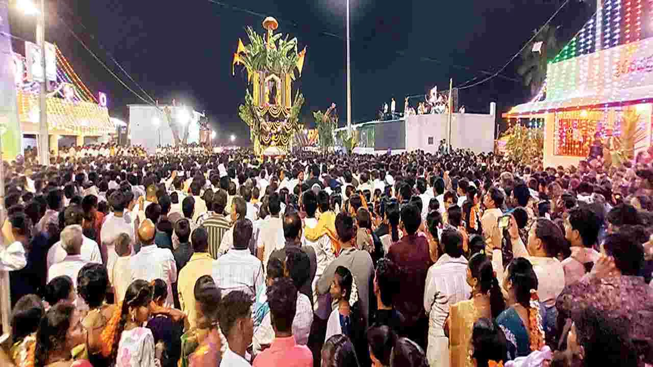 మంత్రాలయం, జనవరి 16 (ఆంధ్రజ్యోతి): రామలింగేశ్వరస్వామి మహా రథోత్సవాన్ని అంగరంగ వైభవంగా నిర్వహించారు. శక్రవారం మంత్రాలయం మండలంలోని రాంపురంలో తుంగభద్ర నది ఒడ్డున వెలసిన రామలింగేశ్వర స్వామి దర్శనం కోసం ఆంరఽధా, కర్ణాటక నుంచి వేలాది మంది భక్తులు తరలివచ్చారు. రాంపురం రెడ్డి సోదరులు, ఆలయ ధర్మకర్తలు, మంత్రాలయం ఎమ్మెల్యే బాలనాగిరెడ్డి, టీటీడీ పాలకమండలి మాజీ సభ్యులు సీతారామిరెడ్డి, కర్నూలు మాజీ ఎమ్మెల్యే వైసీజీ జిల్లా అధ్యక్షుడు ఎస్వీ మోహన్ రెడ్డి, మాజీ ఎమ్మెల్యే సాయిప్రసాద్ రెడ్డి, మాజీ ఎమ్మెల్సీ శివరామిరెడ్డి, మంచాల సొసైటీ మాజీ అధ్యక్షుడు, వైసీపీ జిల్లా ఉపాధ్యక్షులు ప్రదీప్ రెడ్డి, భీమా యూత్ ఽనాయకులు ధరణిధర్ రెడ్డి, భీమారెడ్డి, మనోజ్రెడ్డి, నైరుతిరెడ్డి, ఆంరఽధా, కర్ణాటక వివిధ మఠాలకు చెందిన పీఠాధిపతులను ప్రత్యేక వాహనంపై ఆలయం వరకు భారీ ఊరేగింపు నిర్వహించారు. రాంపురం రెడ్డి సోదరులు ఇంటి నుంచి ఉత్సవమూర్తి ఆలయం వరకు చేరుకుని అక్కడ పూజలు చేసి మహారథంపై ఏర్పాటు చేశారు. ఉత్సవమూర్తిని ఎమ్మెల్యే బాలనాగిరెడ్డి, అర్చకులు తలపై పెట్టుకుని మోసుకువస్తున్న దృశ్యం ఆకట్టుకుంది. మహారథం ముందుకు సాగుతుండగా.. వేలాది మంది భక్తులు స్వామివారిని దర్శించుకుని మొక్కులు తీర్చు కున్నారు. ఆదోని, ఎమ్మిగనూరు, మంత్రాలయం, గుంతకల్లు, ఉరవకొండ, రాయచూరు, మాన్వి, సిందనూరు, అయిజ, గద్వాల నియోజకవర్గాల నుంచి వచ్చిన అభిమానులు రాంపురం సోదరులను ఘనంగా సన్మానించారు. మంత్రాలయం, కోసిగి, కౌతాళం సీఐ రామాంజులు, మంజునాథ్, అశోక్, మాధవరం, మంత్రాలయం ఎస్ఐలు విజయ కుమార్, మల్లికార్జున ఆధ్వర్యంలో పోలీసులతో భారీ బందోబస్తు నిర్వహించారు.