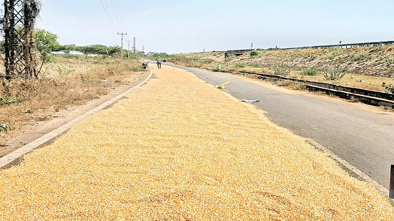 కొంతమంది రైతులు తమ పంట ఉత్పత్తులను రోడ్డుపైనే ఆరబెట్టుతున్నారు
