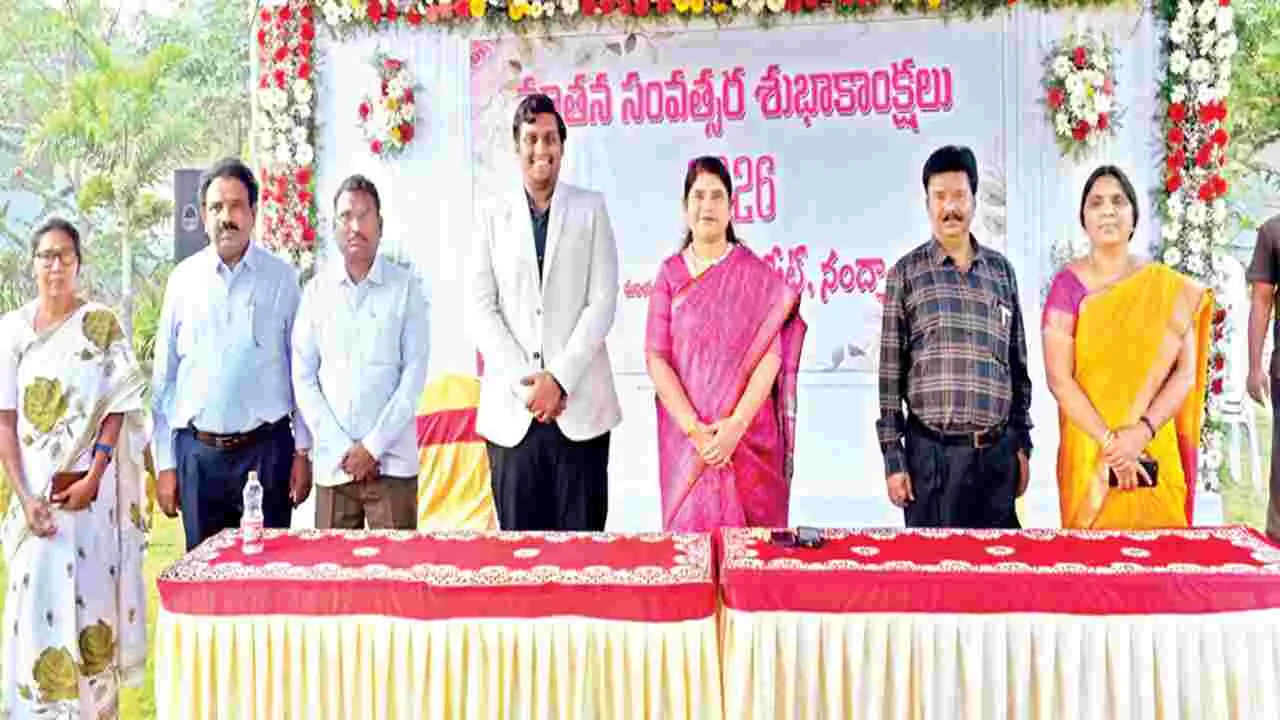 నంద్యాల నూనెపల్లి/నంద్యాల టౌన్, జనవరి 1 (ఆంధ్రజ్యోతి): తీపిచేదు జ్ఞాపకాలను పంచి పెట్టిన 2025కు వీడ్కోలు పలుకుతూ, కోటి ఆశలు, కొంగొత్త ఊసులతో 2026 ఆంగ్లనామ సంవత్సరాన్ని జిల్లా వాసులు ఉత్సాహంగా స్వాగతించారు. కొత్త ఏడాది అంతా సంతోషంగా సాగిపోవాలని, తమ లక్ష్యాలు చేరువ కావాలని ఆకాంక్షిస్తూ వేడుక జరుపుకున్నారు. కొత్త సంవత్సర ఆరంభ వేడుకలు ఆయా ప్రాంతాల్లో బాగా సందడి చేశాయి. బుధవారం అర్ధరాత్రి నుంచే వివిధ ప్రాంతాల్లో ఈ వేడుకను ఘనంగా నిర్వహించారు. అర్ధరాత్రి 12 గంటలకు కేక్లు కట్చేసి, స్వీట్లు పంచుకుంటూ సంబరంగా కొత్త సంవత్సరాన్ని ఆహ్వానించారు. వివిధ చోట్ల సౌండ్ సిస్టమ్లు ఏర్పాటు చేసి, సాంస్కృతిక కార్యక్రమాలను ఉత్సాహంగా నిర్వహించారు. కే క్లను కట్ చేసి పంపిణీ చేస్తూ ‘హ్యాపీ న్యూఇయర్...వెల్కమ్ న్యూ ఇయర్’ అంటూ పరస్పర శుభాకాంక్షలు తెలియజేసుకున్నారు. జిల్లా అధికారులు, వివిధ పార్టీల నేతలు, ప్రజా ప్రతినిధుల ఇళ్ల వద్ద సందడి కనిపించింది. ఆలయాల్లో ఉదయం నుంచి ప్రత్యేక పూజలు జరిగాయి. అదేవిధంగా చర్చీల్లో ప్రత్యేక పార్థనలు జరిగాయి. నంద్యాలలో కలెక్టర్ రాజకుమారి, జాయింట్ కలెక్టర్ కార్తీక్లకు అధికారులు పుష్పగుచ్చాలు అందజేసి శుభాకాంక్షలు తెలిపారు. అదేవిధంగా నంద్యాల ఎస్పీ సునీల్ షెరాన్ను ఏఎస్పీలు, డీఎస్పీలు, సీఐలు, జిల్లా కార్యాలయ సిబ్బంది కలిసి న్యూఇయర్ శుభాకాంక్షలు తెలిపారు.