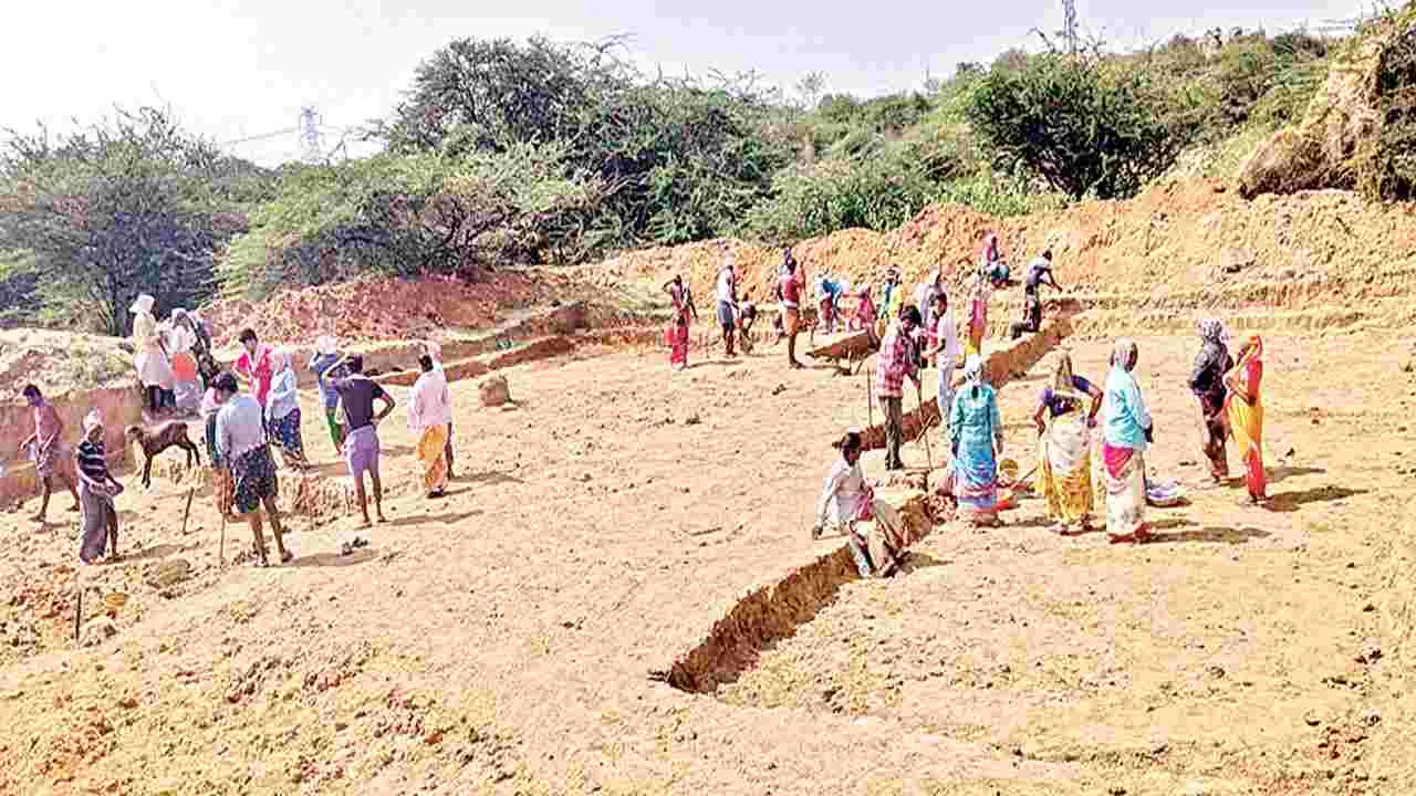 కర్నూలు అగ్రికల్చర్, ఫిబ్రవరి 26 (ఆంధ్రజ్యోతి): వ్యవసాయ కూలీలకు ఉపాధి కల్పించేందుకు నిర్దేశించిన పనిదినాల కల్పనలో రాష్ట్రంలోనే కర్నూలు జిల్లా తొలి స్థానంలో ఉంది. 2025-26 ఆర్థిక సంవత్సరంలో 58 లక్షల పనిదినాలు కల్పించాలని కర్నూలు జిల్లా నీటి యాజమాన్య సంస్థకు ప్రభుత్వం లక్ష్యాన్ని నిర్దేశించింది. ఇప్పటికే ఈ లక్ష్యాన్ని దాటి 63,27,864 పనిదినాలను వ్యవసాయ కూలీలకు కల్పించి కర్నూలు జిల్లా రాష్ట్రంలో అన్ని జిల్లాల కంటే ముందు వరుసలో నిలిచింది. అదే విధంగా నంద్యాల జిల్లాలో 58 లక్షల పని దినాలను వ్యవసాయ కూలీలకు కల్పించాలని లక్ష్యం కాగా, ఇప్పటికి 59 లక్షల పనిదినాలు కల్పించి ఆ జిల్లా నాలుగో స్థానంలో నిలిచింది. ఇప్పటి దాకా వ్యవసాయ కూలీలకు చేసిన పనులకు గాను రూ.146 కోట్లును నంద్యాల జిల్లాలో ఖర్చు చేశారు. అదే విధంగా మెటీరియల్ కాంపొనెంట్ కింద రూ.72.60 కోట్లు ఖర్చు పెట్టారు. పరిపాలనా ఖర్చు రూ.12.78 కోట్లు ఖర్చయిందని, మొత్తం మీద ఈ ఆర్థిక సంవత్సరం ఇప్పటి వరకు రూ.231.16 కోట్లు ఖర్చు చేసినట్లు కర్నూలు జిల్లా నీటి యాజమాన్య సంస్థ అధికార వర్గాలు తెలిపాయి. గ్రామాల్లో మౌలిక వసతుల కల్పన కింద గోకులం షెడ్లు 1400 నిర్మించాల్సి ఉండగా.. రూ.26.97 కోట్లతో 350 గోకులాల షెడ్లు నిర్మించారు. ఇంకా 778 షెడ్లు పురోగతిలో ఉన్నాయి. అదే విధంగా ఫారం పాండ్ల నిర్మాణానికి సంబంధించి 4వేల పనులను పూర్తి చేయాలని నిర్దేశించారు. ఇందులో 170 పనులు పూర్తి కాగా, 312 పనులు పురోగతిలో ఉన్నాయి. మరో వైపు ఇంకుడు గుంతలు రూ.1.33 కోట్ల అంచనాతో 2,420 గుంతలు తవ్వాల్సి ఉండగా.. ఇప్పటికి 1842ను పూర్తి చేశారు. మరో 578 పనులు పురోగతిలో ఉన్నాయి. కంపోస్టు గుంతలు ఏర్పాటుకు సంబంధించి రూ.2.18 కోట్ల అంచనాతో 23 ఎరువుల తయారీ గుంతలు తయారు చేయాలని లక్ష్యం కాగా, అందులో 14,715 ఎరువుల తయారీ గుంతలు ఏర్పాటు చేశారు. నంద్యాల జిల్లాలో వేతనాల కోసం ఈ ఆర్థిక సంవత్సరంలో ఇప్పటి వరకు 141.59 కోట్లు ఖర్చు చేశారు. మెటీరియల్ కంపొనెంట్ కింద మౌలిక వసతుల కోసం రూ.71.45 కోట్లు ఖర్చు చేశారు. వీటితో పాటు పరిపాలనా ఖర్చు రూ.9.50 కోట్లను కలుపుకొని ఇప్పటి దాకా ఈ ఉపాధి పథకానికి రూ.222.54 కోట్లు ఖర్చు చేశారు. నంద్యాల జిల్లాలో 601 గోకులం షెడ్లను ఈ పథకం కింద మంజూరు చేయగా.. ఇప్పటికి 262 షెడ్లు పూర్తయ్యాయి. ఇంకా 236 షెడ్లు వివిధ దశలో ఉన్నాయి. అదేవిదంగా 662 ఫారం పాండ్లు మంజూరు కాగా, ఇప్పటికి మూడు మాత్రమే పూర్తయ్యాయి. ఇప్పటికీ 43 పనులు పురోగతిలో ఉన్నట్లు ఆ జిల్లా అధికార వర్గాలు తెలిపాయి. 5,375 గుంతలు తవ్వాలని లక్ష్యం పెట్టుకోగా, ఇప్పటికి 1,812 పనులు పూర్తయ్యాయి. 929 పనులు పురోగతిలో ఉన్నాయి. 13,788 గుంతలు తవ్వాలని లక్ష్యం పెట్టుకోగా, ఇప్పటికి 9,584 పనులు పూర్తి చేశారు.