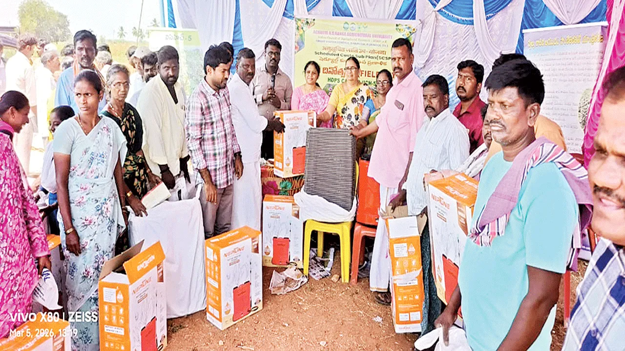 కోసిగి, మార్చి 5 (ఆంధ్రజ్యోతి): సాంకేతిక సాగు పద్ధతులను అనుసరిస్తే ఆముదం పంటలో అధిక దిగుబడులు సాదించొచ్చని జిల్లా వ్యవసాయ శాఖ అధికారి వరలక్ష్మి అన్నారు. గురువారం మండలంలోని కామన్దొడ్డి గ్రామంలో ఆచార్య ఎన్జీరంగా వ్యవసాయ విశ్వవిద్యాలయం బనవాసి కేవీకే భారత నూనెగింజల పరిశోధన సంస్థ ఐఐవోఆర్ సంయుక్త ఆధ్వర్యంలో అధిక సాంధ్రత ఆముదం పంటపై క్షేత్ర దినోత్సవం నిర్వహించారు. మండల వ్యవసాయ అధికారి ఎం.వరప్రసాద్ అధ్యక్షతన నూనెగింజల సాగుపై కేంద్రం ప్రత్యేక దృష్టి పెట్టిందని జేడీ వరలక్ష్మి పేర్కొన్నారు. హెచ్డీపీఎ్స విధానంతో మెరుగైన దిగుబడి అని ప్రధాన శాస్త్రవేత్త డా.పి.లక్ష్మమ్మ అన్నారు. దళిత రైతులకు ఎస్సీ పథకం కింద రైతులకు ఉచితంగా తార్పాలిన్లు, స్పేయర్లను అధికారులు పంపిణీ చేశారు. శాస్త్రవేత్త డా.రమ్య, ఏడీఏ బాలవర్ది రాజు, ఏవో వరప్రసాద్, రైతులు ఉన్నారు
